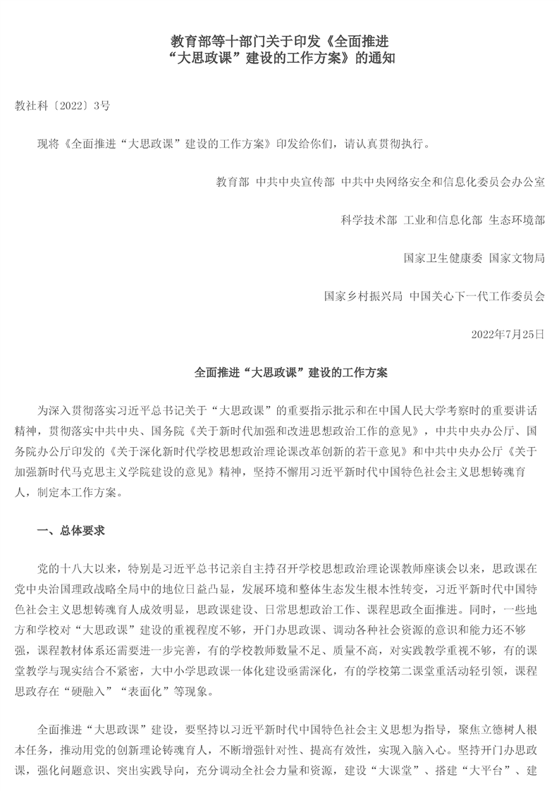 教育部等十部门关于印发《全面推进“大思政课”建设的工作方案》的通知 - 来自中华人民共和国教育部政府门户网站