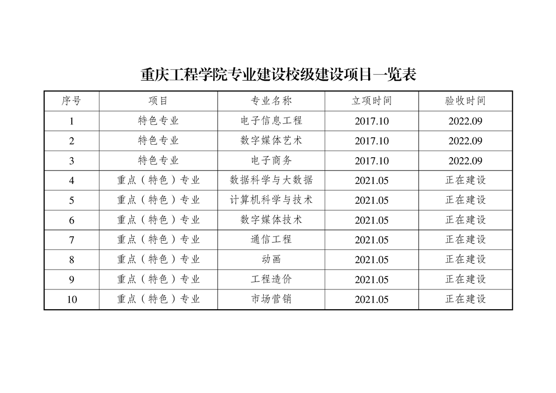 重庆工程学院专业建设校级建设项目一览表