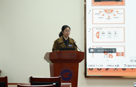 接下来,教务处处长杨倩作题为《对标对表找差距,凝心聚力抓落实》的主题报告。报告总结了2022年度人才培养顶层设计、教学建设工作、教学管理工作等本科教学工作中取得的成绩,深入分析了当前教学工作面临的形势和任务,指出存在的问题和不足。同时,从十一个方面对2023年的教学重点工作进行了部署,一是要持续优化人才培养方案;二是进一步加强案例库、项目库建设与使用;三是完善校内实习基地建设与管理;四是推进“工学交替”教学模式探索;五是继续推进专业建设与课程建设;六是加强教学质量监控;七是进一步加强教学规范的深入全面实施;八是推动基层教学组织、优秀教学团队建设;九是进一步提高教学管理人员的管理能力与水平;十是启动教学成果奖培育项目;十一是持续开展迎评工作。