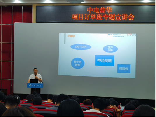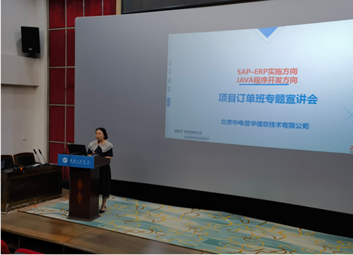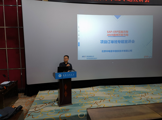 6月30日,北京中电普华信息技术有限公司重庆区域邓总、重庆正大华日软件有限公司副总经理马国盛等一行到校开展中电普华SAP-ERP实施、JAVA程序开发方向项目订单班专题宣讲会,学校相关人员及全校共150余名同学参加。会议由教务处(校企合作办公室)副处长许欢欢主持。