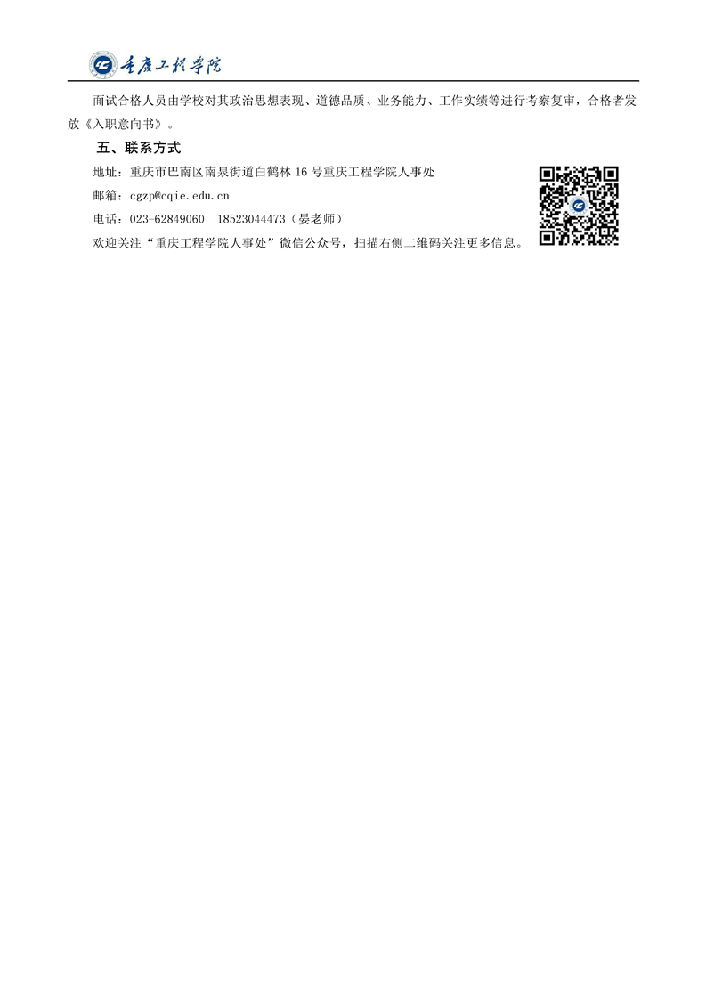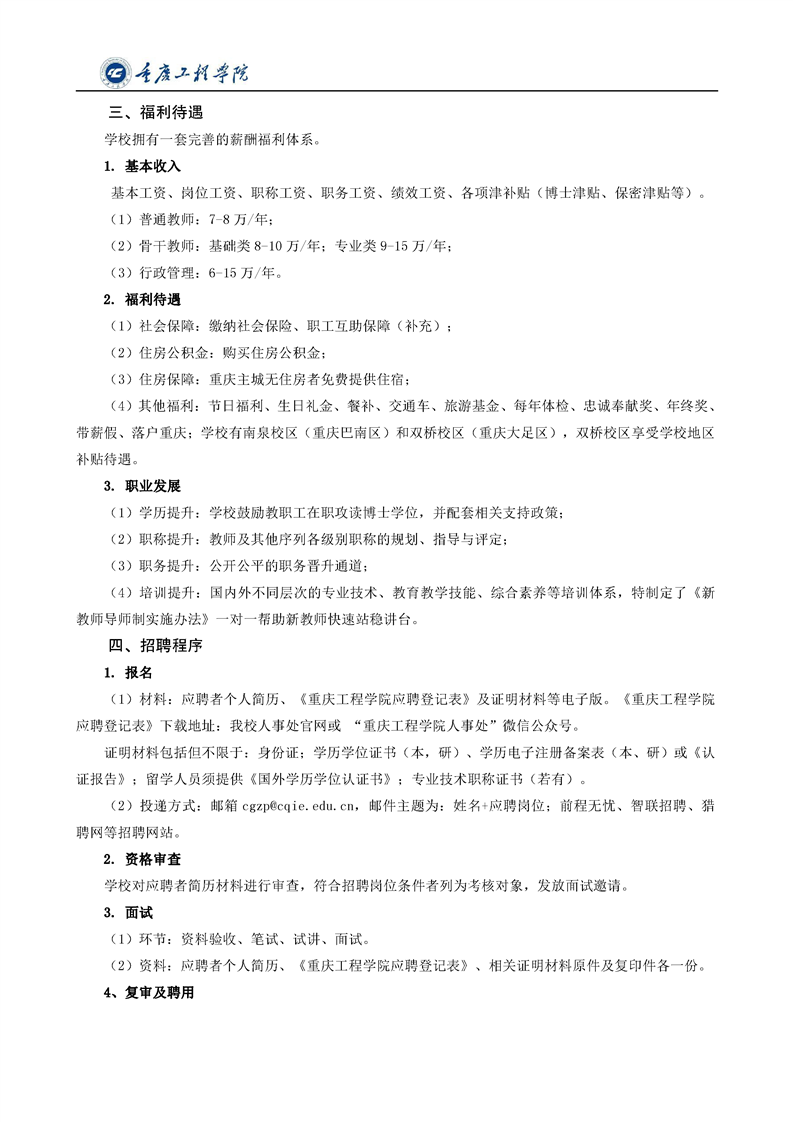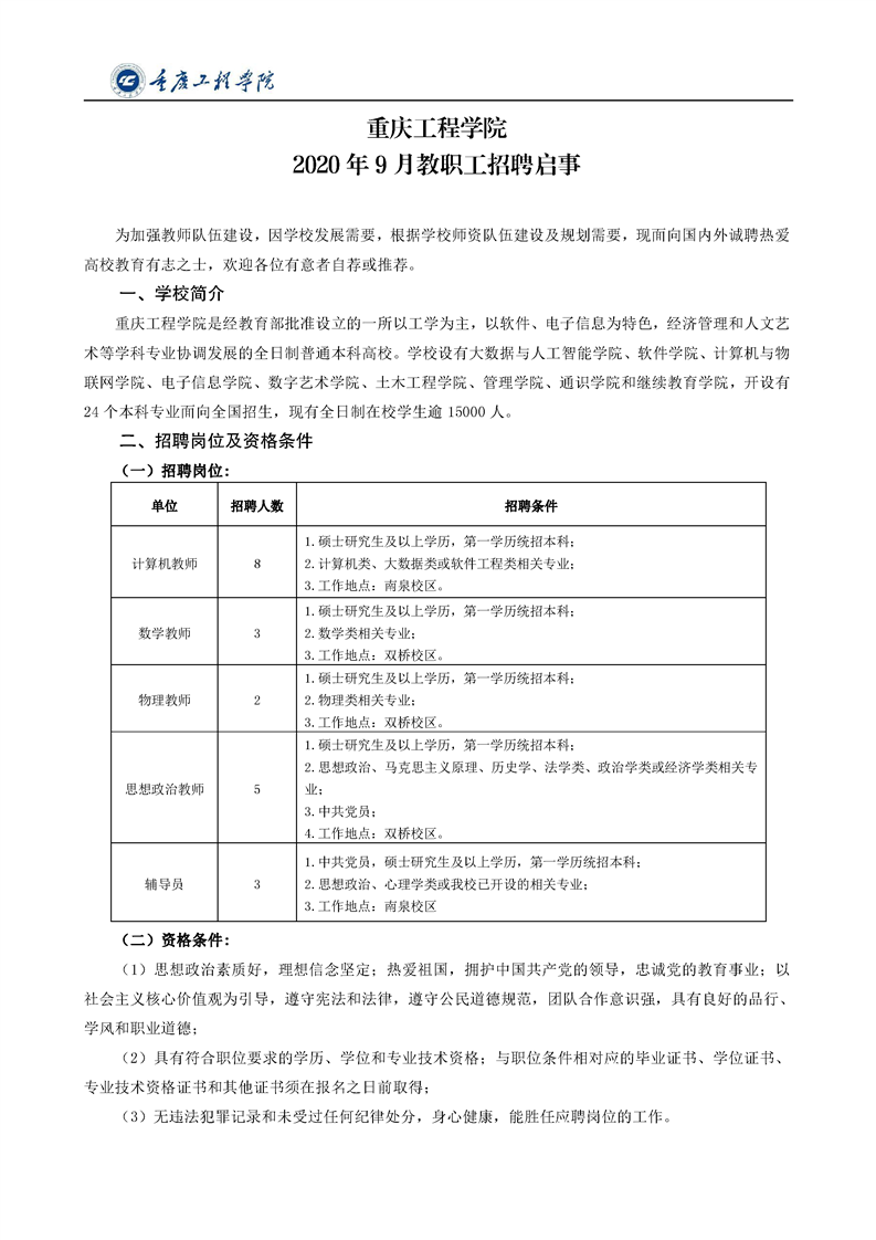 重庆工程学院2020年9月教职工招聘启事