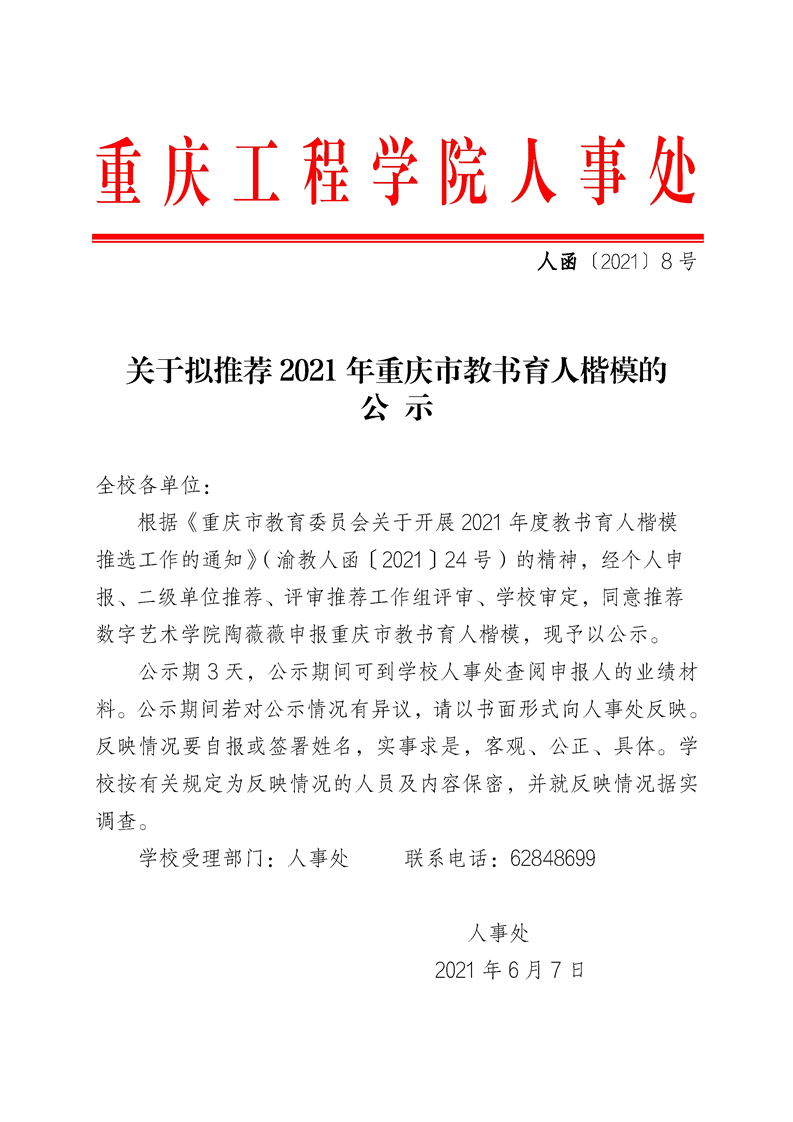 关于拟推荐2021年重庆市教书育人楷模的公示