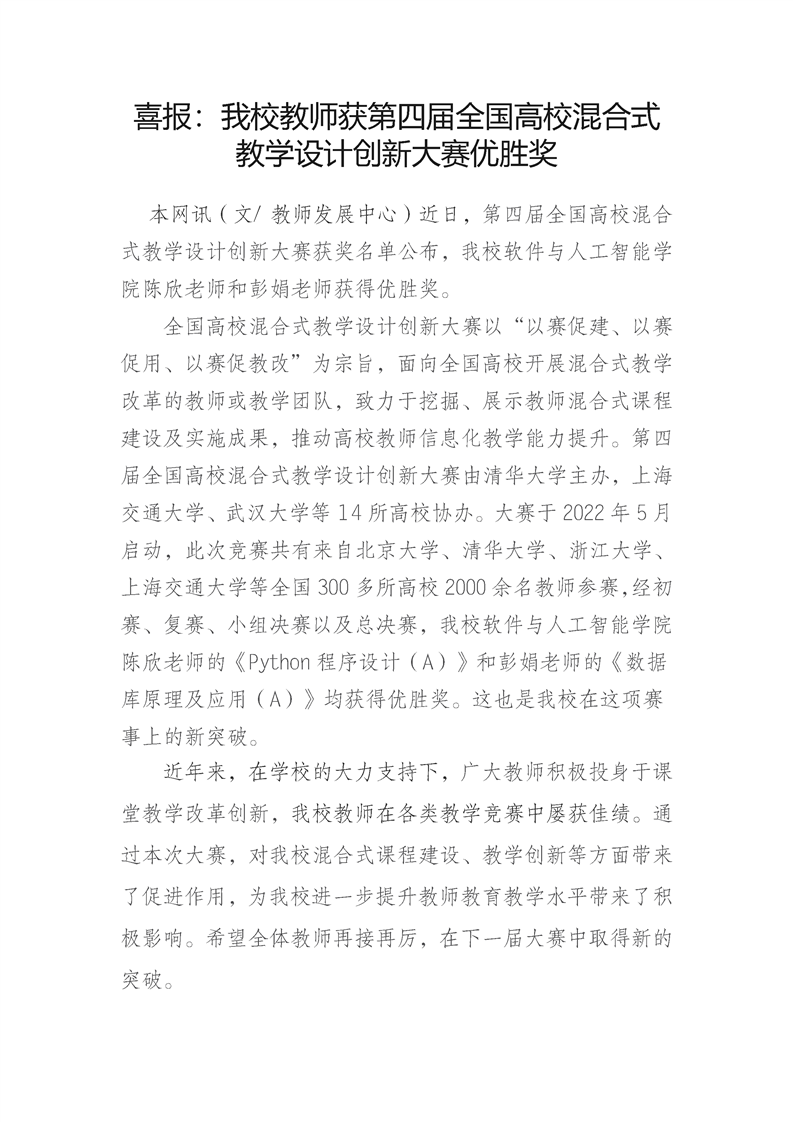 喜报:我校教师获第四届全国高校混合式教学设计创新大赛优胜奖