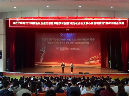 本网讯(校团委 尚伟)为学习宣传贯彻习近平新时代中国特色社会主义思想,培育和践行社会主义核心价值观,2018年4月18日我校在学术报告厅举行习近平新时代中国特色社会主义思想专题学习会暨“我为社会主义核心价值观代言”演讲比赛总决赛。最终,管理学院熊烨同学荣获一等奖,动画与数字影视学院李西娅荣获二等奖,软件与计算机学院张亮同学荣获三等奖。