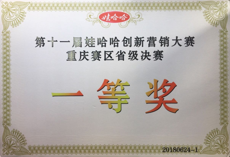 佩柒团队 第十一届娃哈哈市场营销技能大赛获奖证书(市一等奖)
