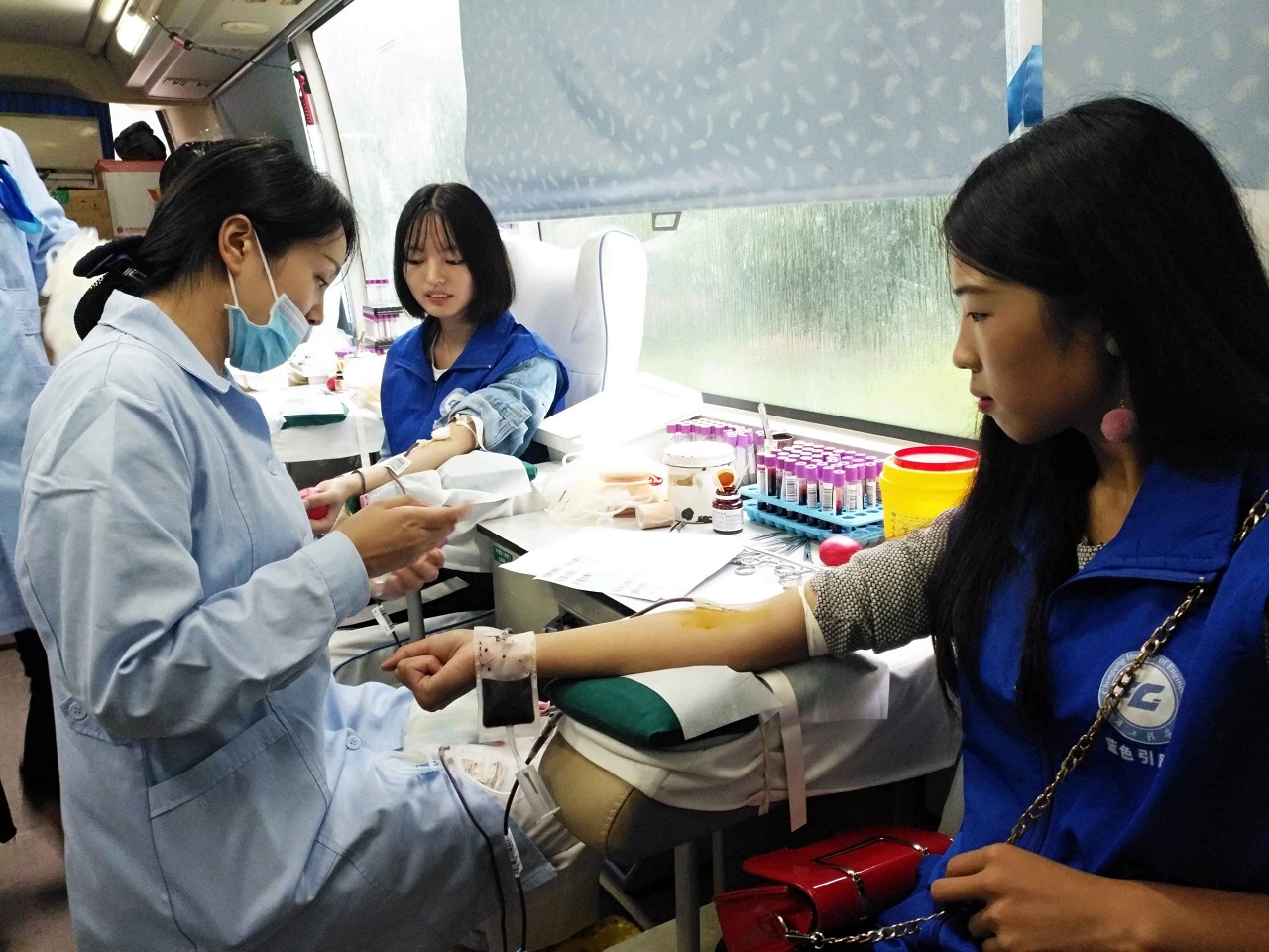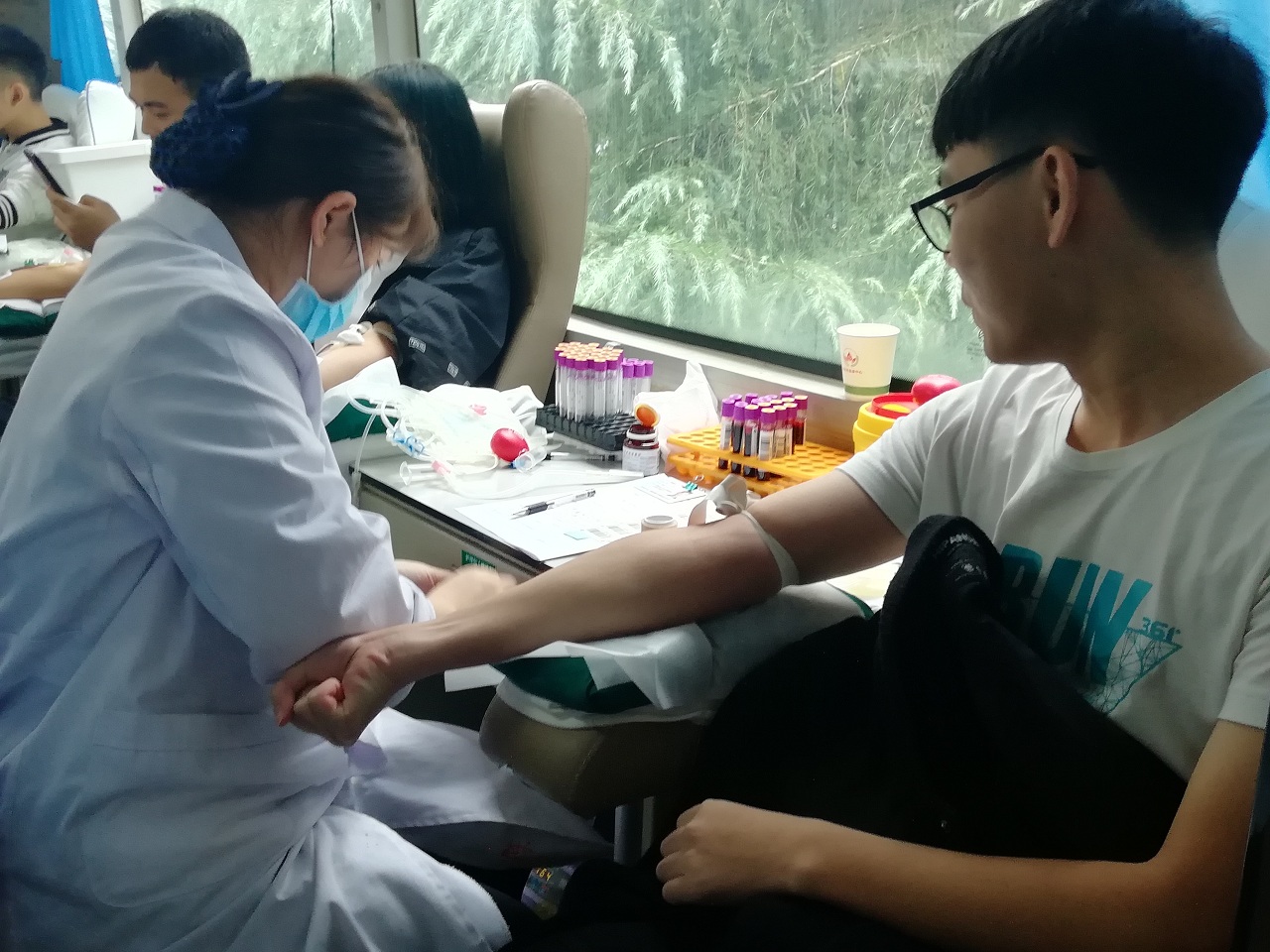 在献血现场,咨询、填表、体检、化验、等候、抽血、休息,所有流程都在医护人员和志愿者的指引下井然有序地进行。虽然天空下着毛毛细雨,但志愿者们献血的热情不减。同学们手握着鲜红的《无偿献血证》,脸上都洋溢着快乐的笑容,纷纷表示,献血是利人利己的好事,举手之劳,大家都应该积极参与,传递爱心。