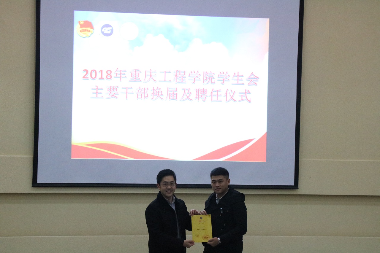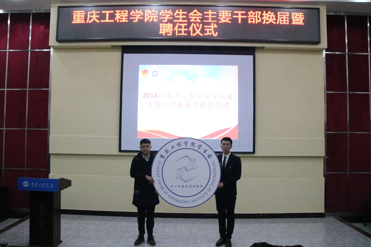 本网讯(校学生会宣传部 文/傅相美 翟辉银 图/周广) 为持续学生会工作的连续性,培养一批高素质、高水平的学生会干部,也为了以后更好服务老师与同学,重庆工程学院学生会于2018年12月28日晚17:40,在行政报告厅进行学生会主要干部换届暨聘任仪式。