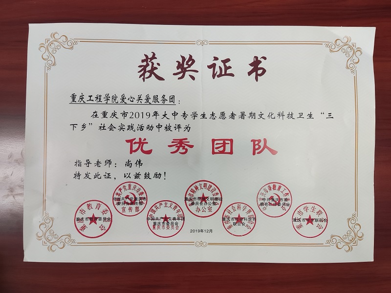 重庆工程学院爱心关爱服务团在重庆市2019年大学生暑期三下乡社会实践活动中被评为优秀团队