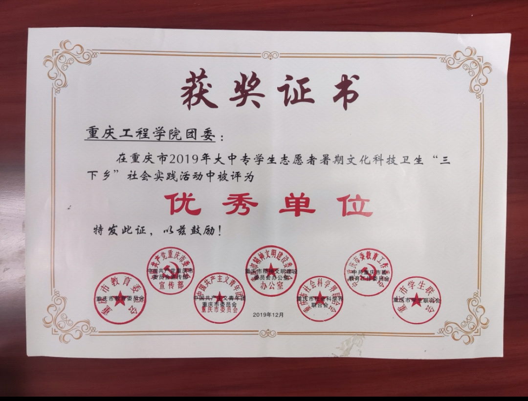 重庆工程学院团委在重庆市2019年大学生暑期三下乡社会实践活动中被评为优秀单位