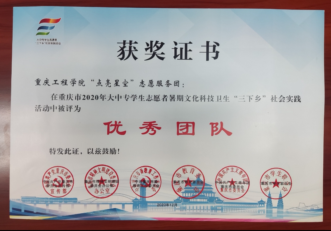 重庆工程学院”点亮星空“志愿服务团在重庆市2020年暑期三下乡社会实践中被评为优秀团队