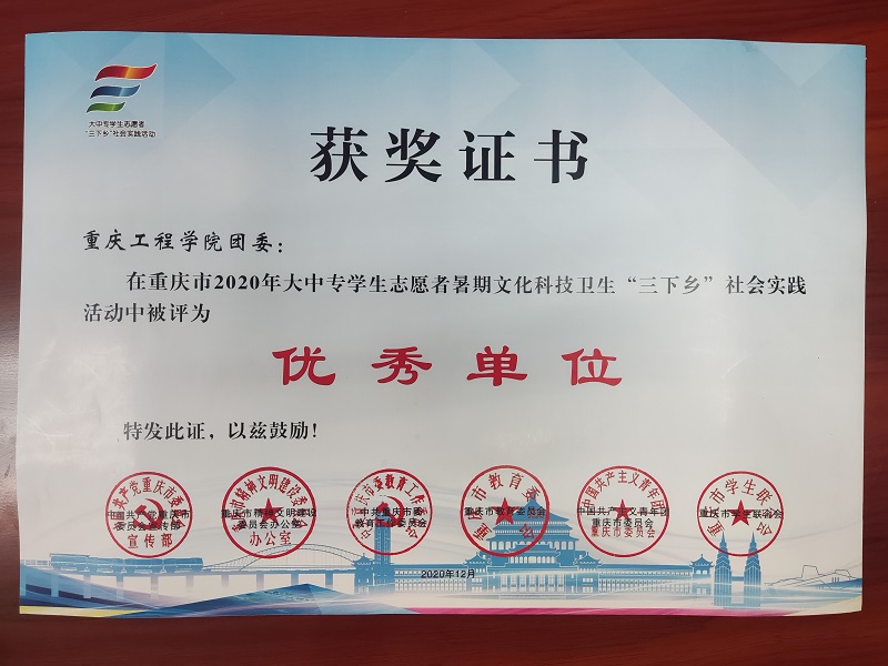 重庆工程学院团委在重庆市2021年大中专学生志愿者暑期文化科技卫生三下乡社会实践活动中被评为优秀单位