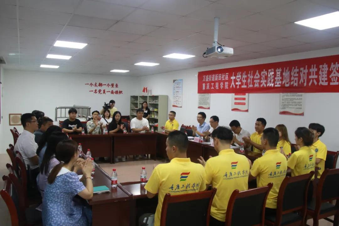 在社区会议室,学校与万盛街道新田社区举行大学生社会实践基地签约仪式,共青团万盛经开区委书记田敏、万盛街道党委书记刘洪波、新田社区党工委书记王健与学校领导共同出席签约仪式。