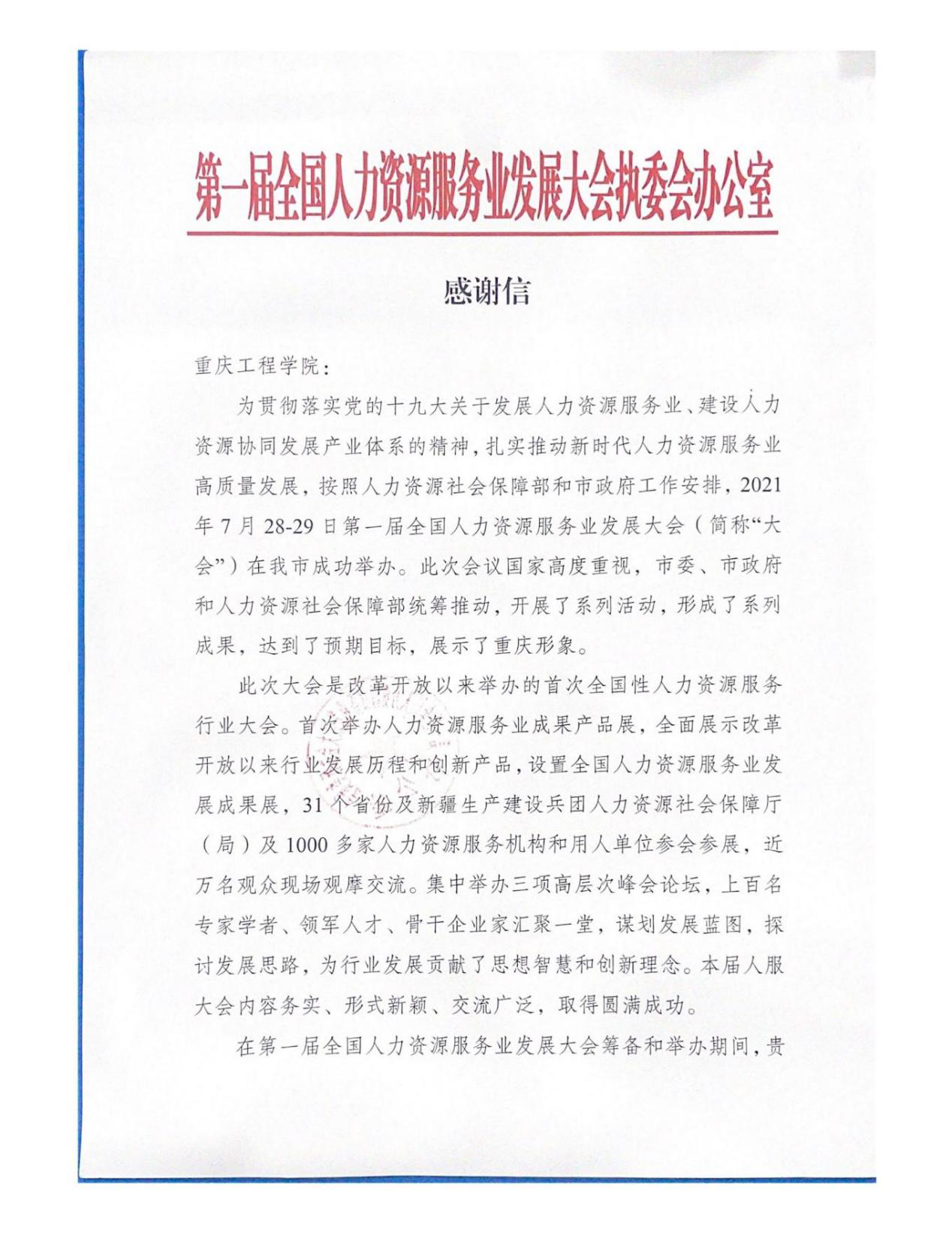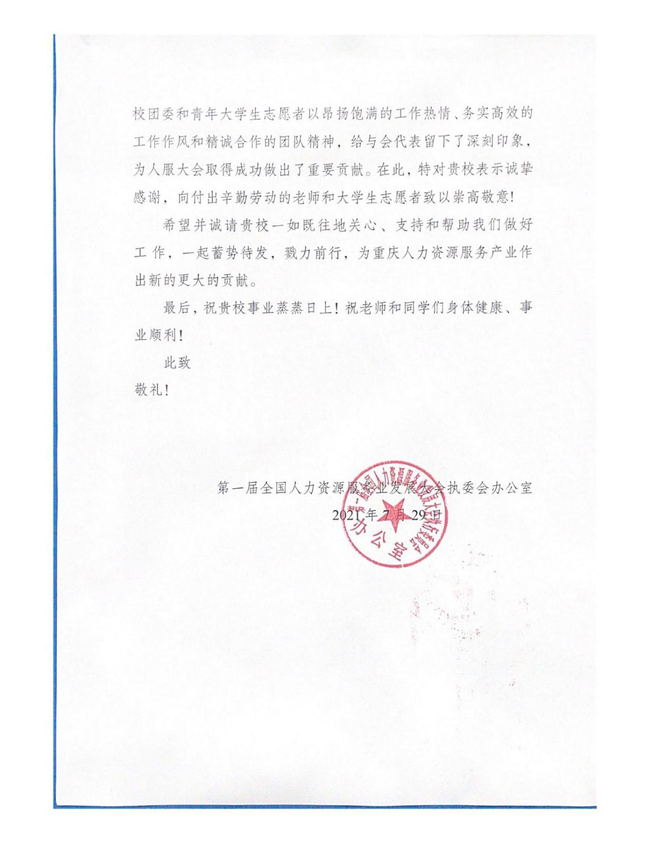 (本网讯 文/金质纯)近日,第一届全国人力资源服务业发展大会执委会办公室专程为我校发来感谢信,感谢我校团委和青年大学生志愿者在第一届全国人力资源服务业发展大会志愿服务工作中的倾情参与和辛勤劳动。