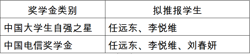根据共青团重庆市委《关于组织开展2020年度“中国大学生自强之星”推报活动的通知》及《关于组织开展2020年度“中国电信奖学金”推报评选工作的通知》文件要求,经学生个人申请、学生生源地团委推荐、学校评委会资格审查和评选等环节,拟推报以下学生进入市级评选。现将名单公示如下,公示期:9月6日—9月12日,如有异议,请实名反馈,联系人:易老师,联系电话023-62846693。