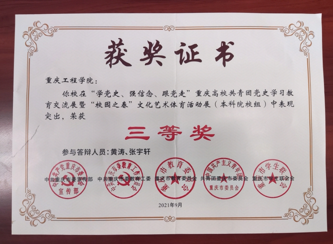 重庆工程学院在“学党史、强信念、跟党走“重庆高校共青团党史学习教育交流暨校园之春文化艺术体育活动展(本科院校组)中表现突出,荣获三等奖