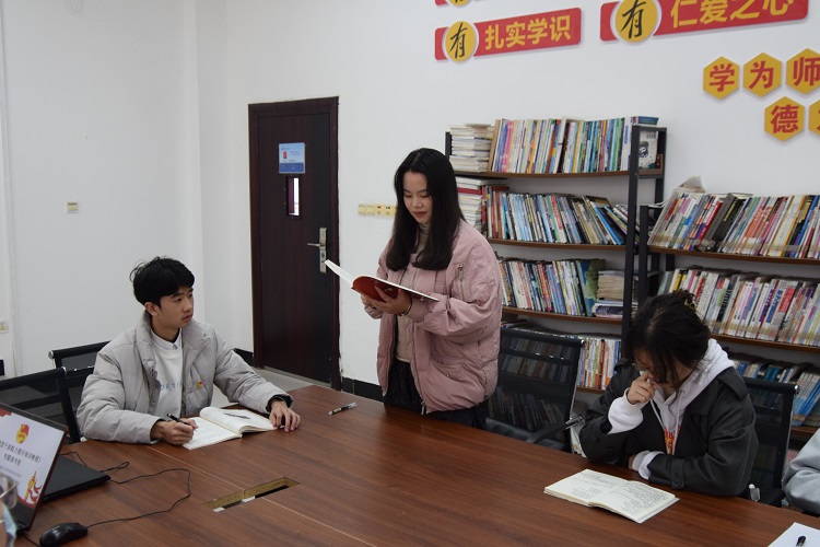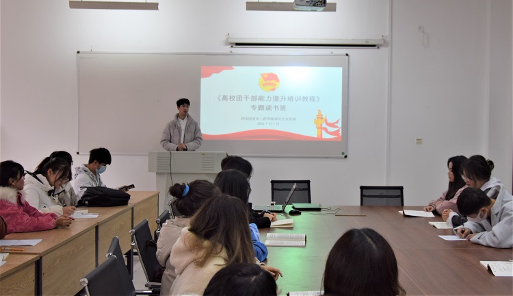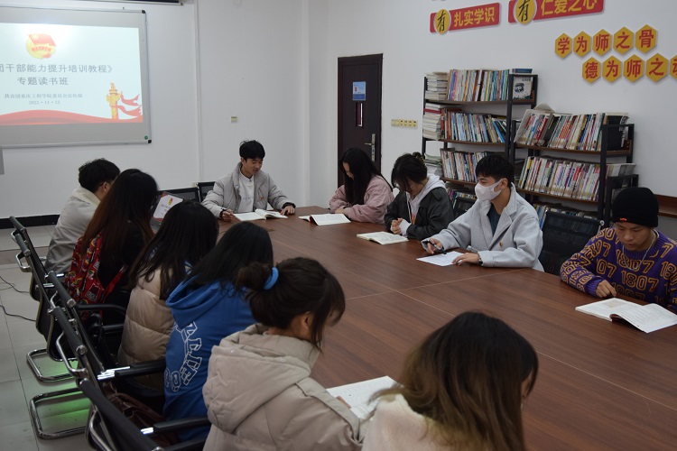 而后在陈江林的主持下,全体成员共同学习了《高校团干部能力提升培训教程》相关知识,通过读书班的形式学习,引导全体成员不断树立责任意识,不断培养团干部所应具备的基本素养和能力。陈江林也强调,我们作为高校团干部,理应以身作则,不断提升自身技能和能力,争做一名合格优秀的高校团干部。
