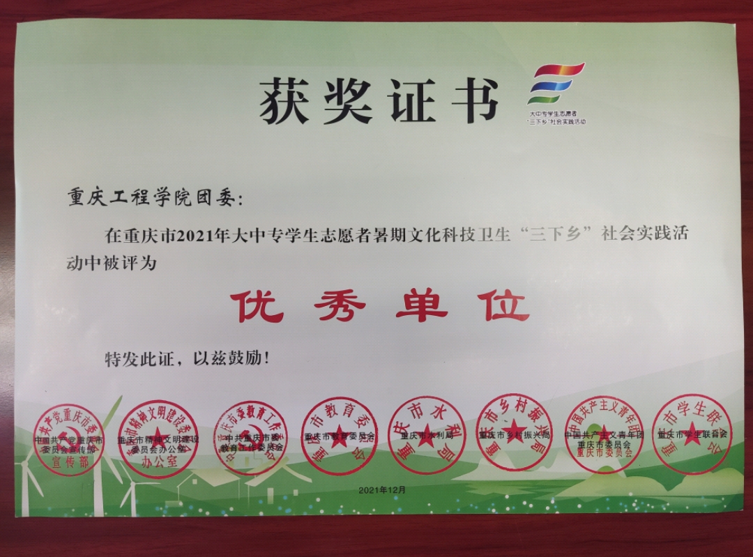 重庆工程学院团委在重庆市2021年大中专学生志愿者暑期文化科技卫生三下乡社会实践活动中被评为优秀单位