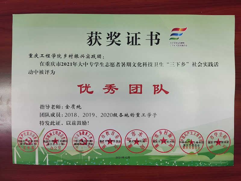 重庆工程学院乡村振兴实践团在重庆市2021年大学生暑期三下乡社会实践活动中被评为优秀团队