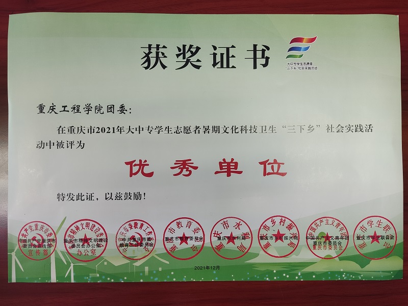 重庆工程学院团委在重庆市2021年大中专学生志愿者暑期文化科技卫生三下乡社会实践活动中被评为优秀单位