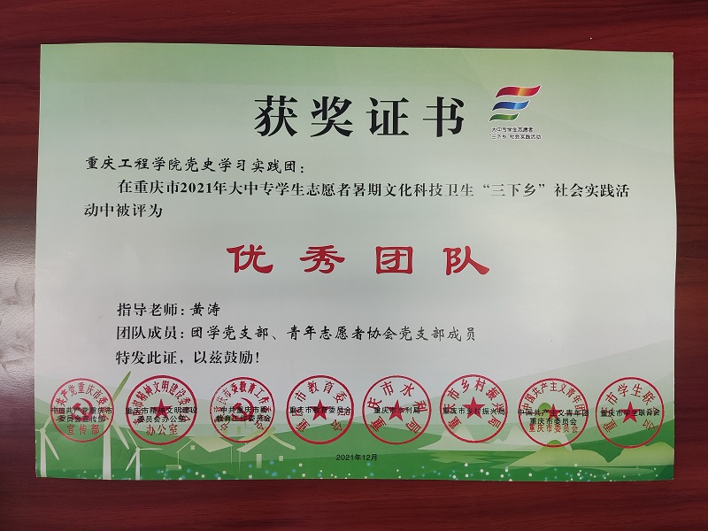 重庆工程学院党史学习实践团在重庆市2021年大学生暑期三下乡社会实践活动中被评为优秀团队