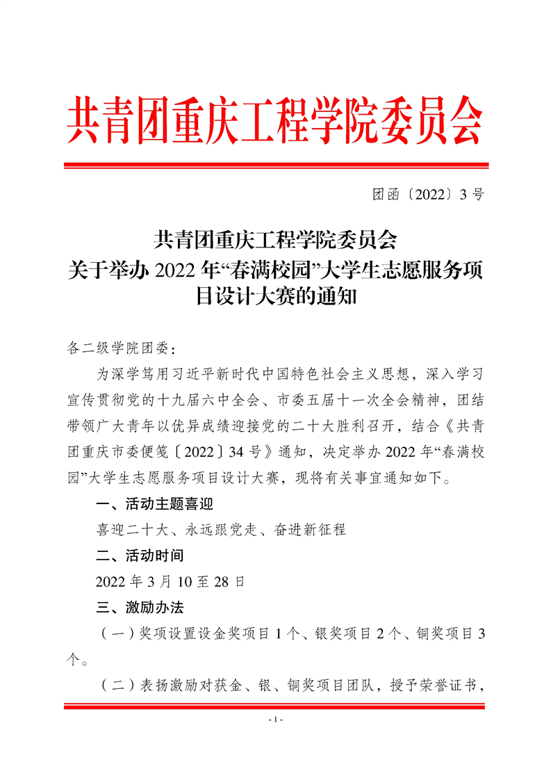 共青团重庆工程学院委员会 关于举办2022年“春满校园”大学生志愿服务项 目设计大赛的通知