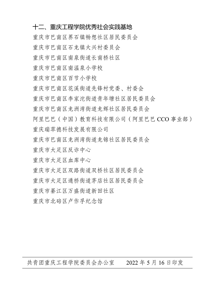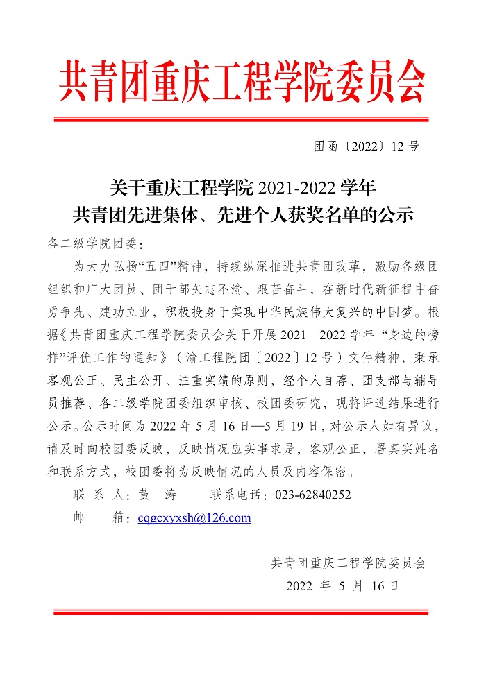 关于重庆工程学院 2021-2022 学年 共青团先进集体、先进个人获奖名单的公示