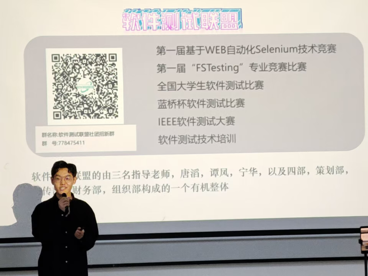 为了给同学们揭开软件测试的神秘面纱,软件测试联盟于2022年10月28日18:00-19:00,在第六教学楼204教室开展与软测成员的第一次会面(含线上双桥校区同学)。本次活动流程包括负责人对软件测试联盟测试的组织架构和发展方向介绍,通知社团规章制度,学长寄语,最后指导教师谭凤老师与同学们展开深刻交流。对同学进行重点解读同学们对软件测试联盟充满期待,积极配合老师,参与到与身边同学的互动中。