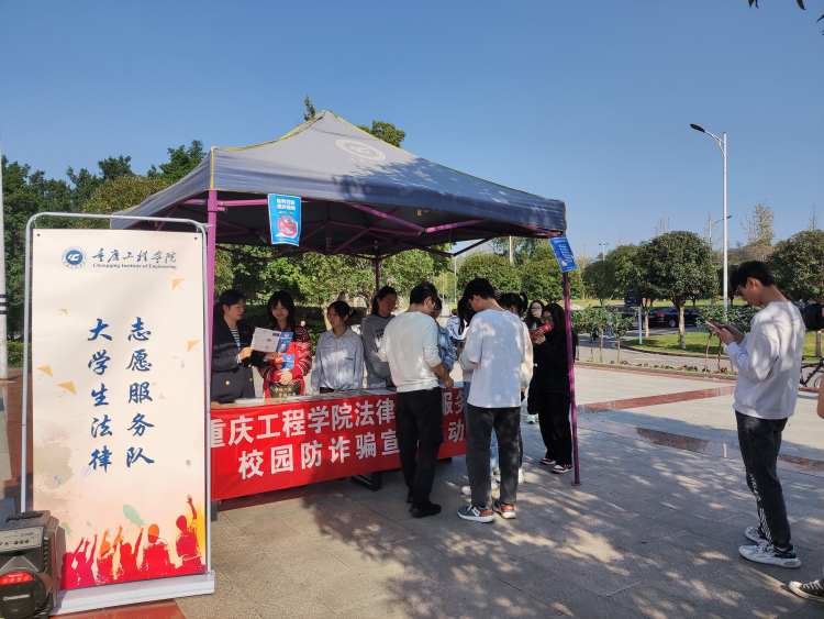为进一步提升大学生防诈意识和风险防控能力,提高群体的自我保护意识,维护大学生合法权益,2022年11月2日14:00重庆工程学院大学生法律志愿服务队社团在和园5号广场开展了校园防诈骗宣传活动。