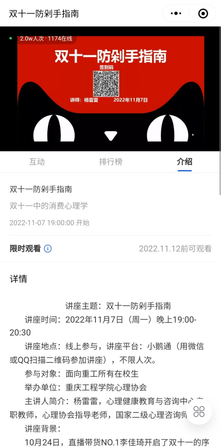 随着“双十一”购物节临近,不少人准备在购物节中大展拳脚,开始剁手式的消费。如何在无孔不入、防不胜防的广告中保持冷静呢?商家诱导人们进行消费背后的心理现象和原理是什么样呢?为了帮助大学生在购物过程中,建立理性消费、超前理财的观念,心理协会于2022年11月7日周一晚上19:00-20:30在小鹅通平台,邀请心理中心杨雷雷老师,开展以“双十一防剁手指南”为主题的讲座活动,结合知识和具体事例,向同学们介绍生活中很常见的场景,却不为人知的消费心理学,本次讲座直播参与人数达到4900余人次。