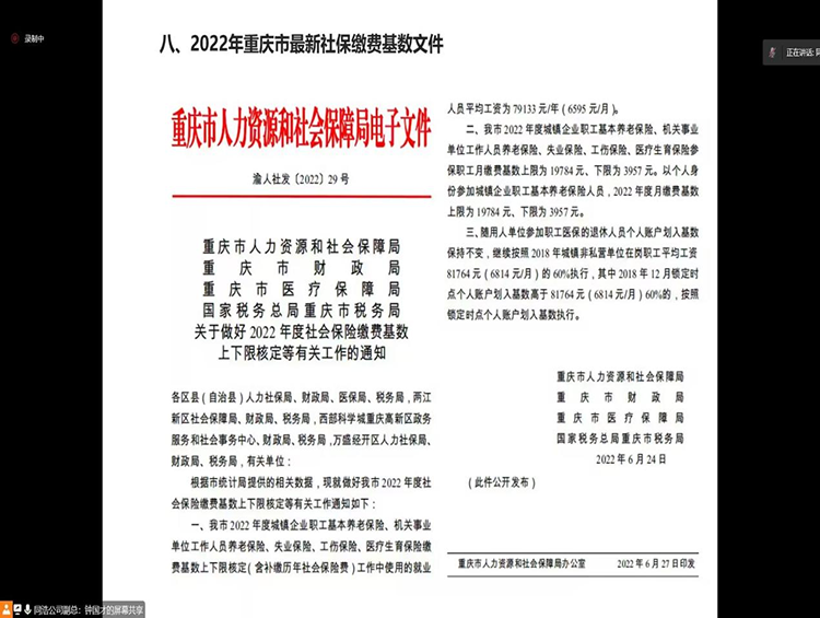 为了大家更了解国家社会保障的政策和具体内容,于2022年11月23日晚上七点HR协会邀请同浩公司副总钟国才老师为同学开展“社会保障实操分享”讲座。此次活动参与人数为243位。 此次活动增长了同学们关于社会保障的知识,了解到了更多国家政策,让大家得到了更多的收获。