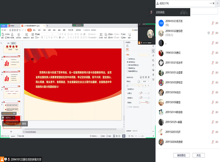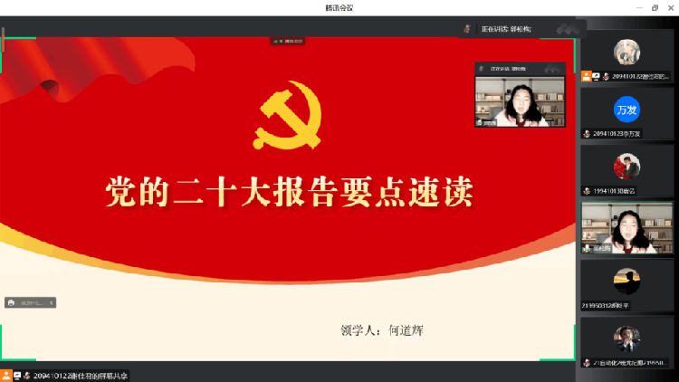 为了全面学习把握落实党的二十大精神,充分认识党的二十大的重要意义,2022年11月23日20:00,自动化创新应用协会在腾讯会议平台举行了“学习党的二十大,争做时代新青年”活动。本次活动共有121人参加。