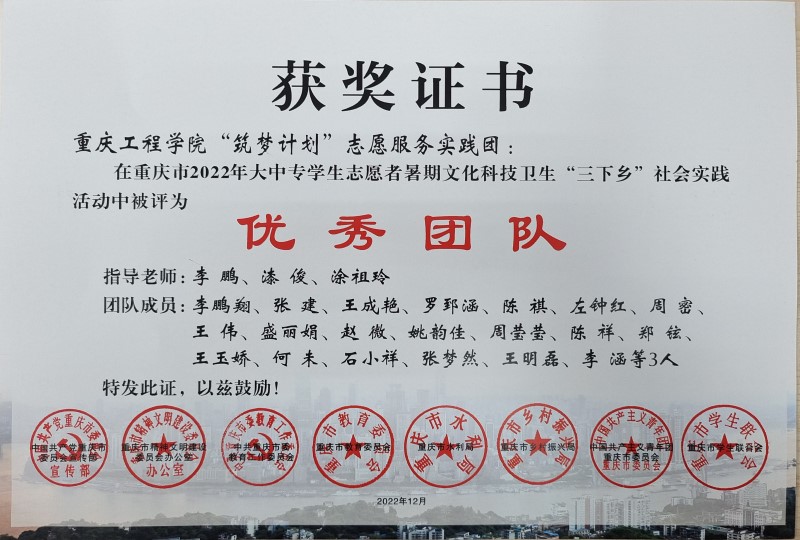 重庆工程学院“筑梦计划”志愿服务实践团在2022年大中专学生志愿者暑期文化科技卫生“三下乡”社会实践活动中被评为优秀团队