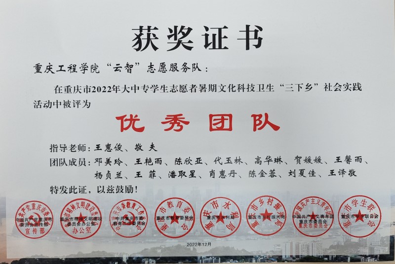重庆工程学院“云智”志愿服务队在重庆市2022年大中专学生志愿者暑期文化科技卫生“三下乡”社会实践活动中被评为优秀团队