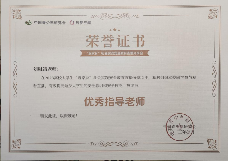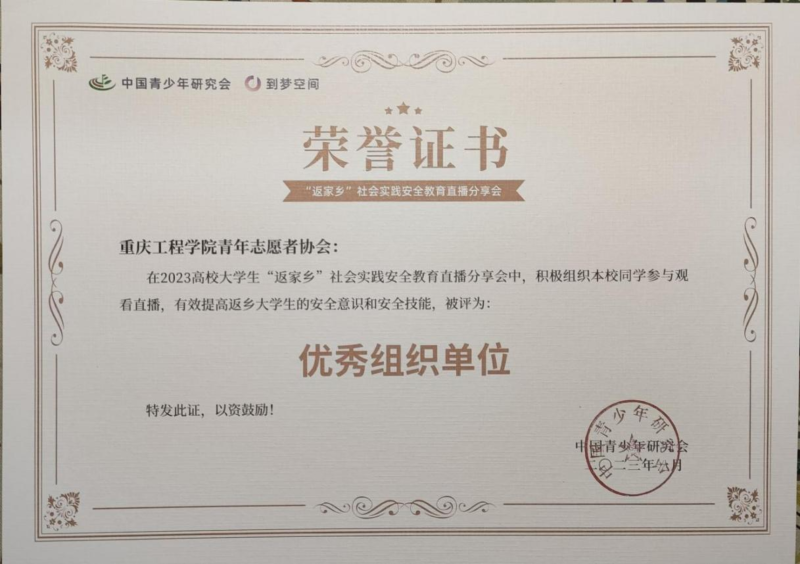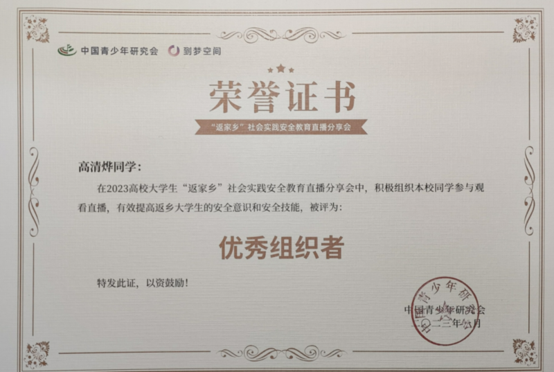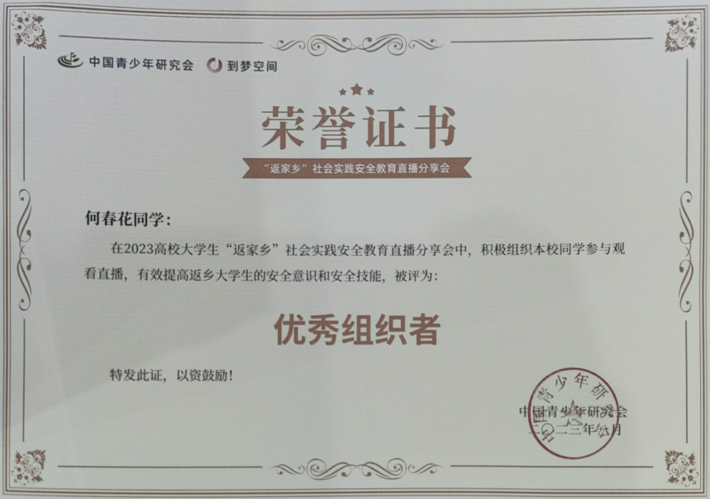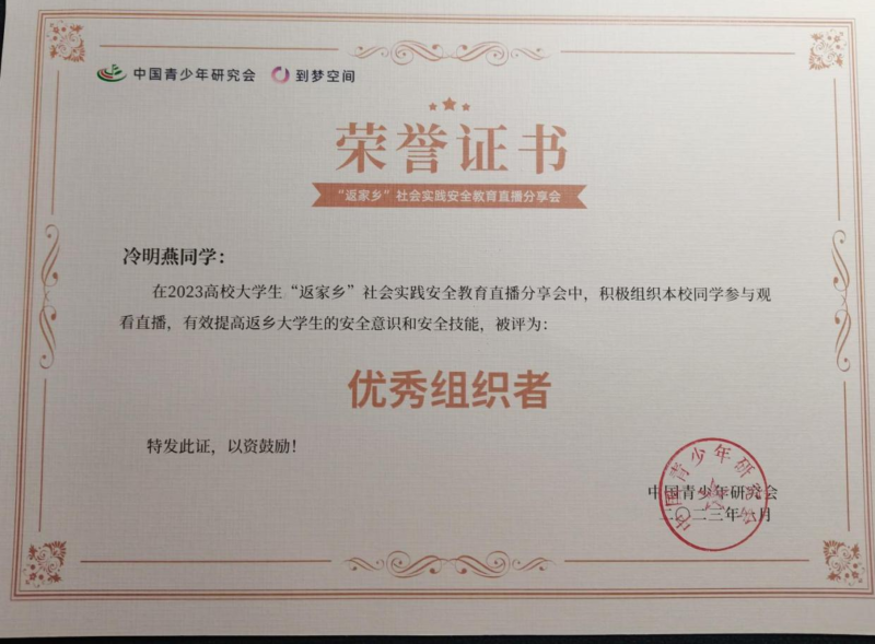 本次高校大学生“返家乡”社会实践安全教育直播分享会,我校青年志愿者协会荣获“优秀组织单位”,校团委刘琳靖老师荣获“优秀指导老师”称号,软件学院20级高清烨、管理学院20级冷明燕、建筑工程学院21级何春花等3名同学荣获“优秀组织者”称号。