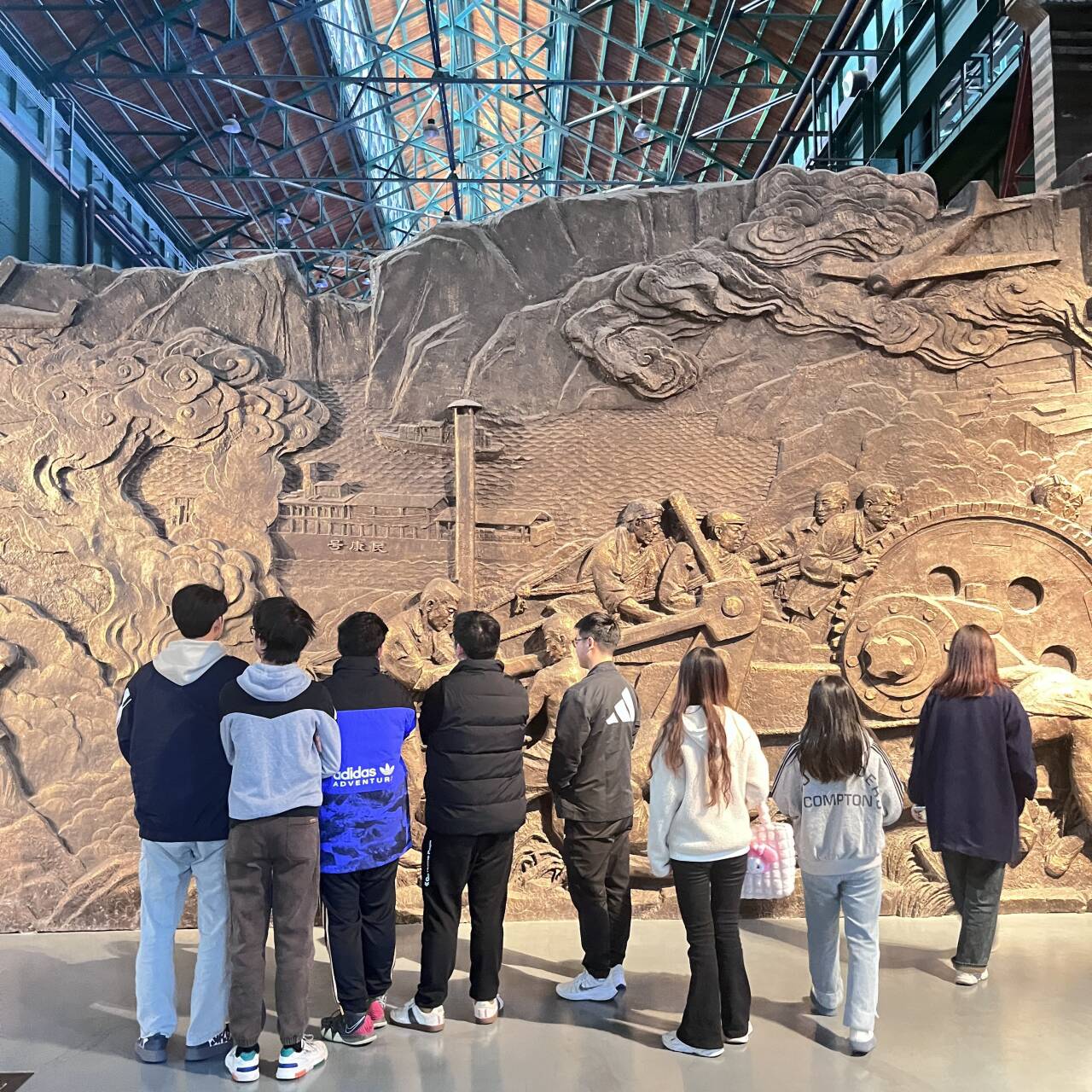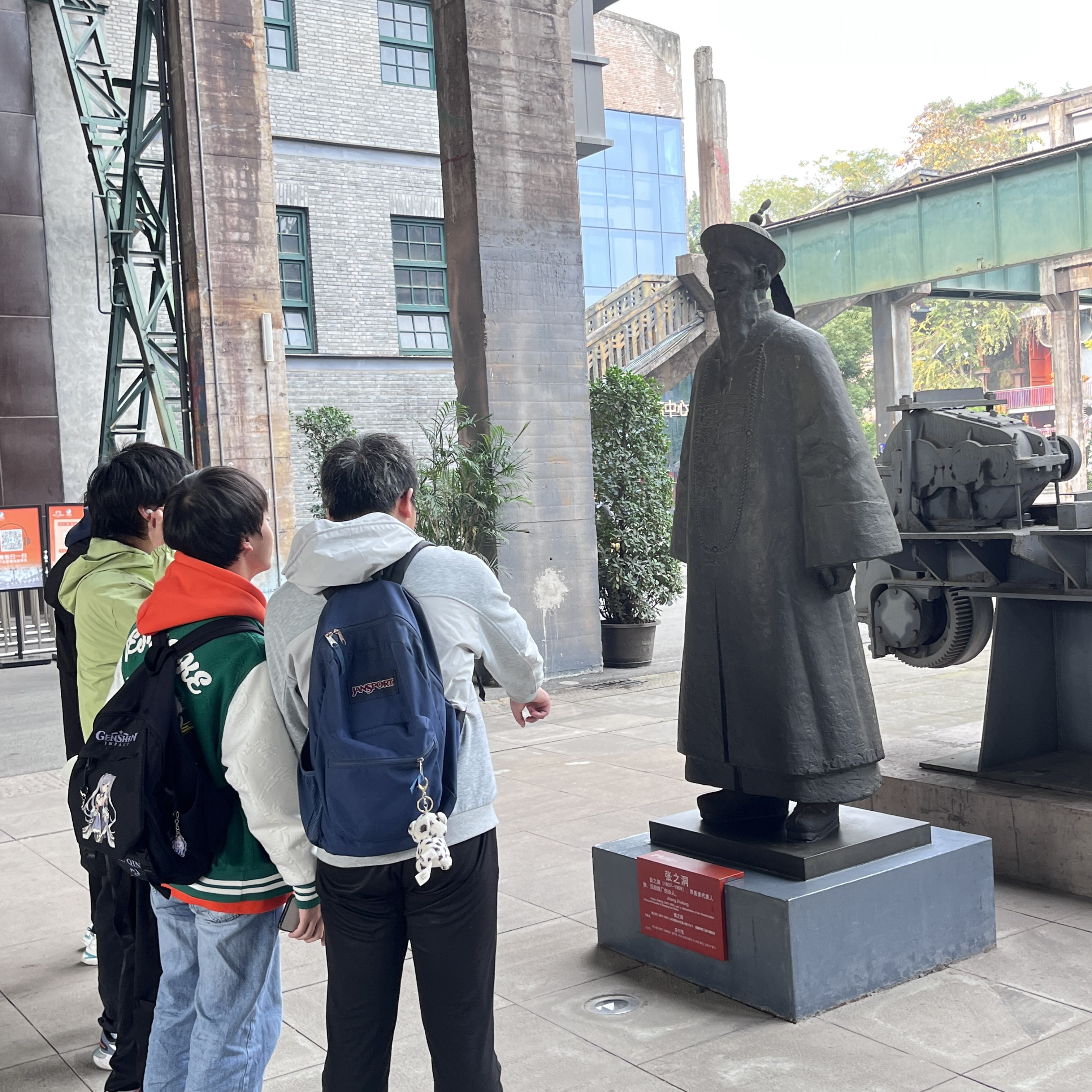 穿过一个隧道,博物馆的面貌印入眼帘:有年代感的火车头、工人们的雕塑、保留的车间、斑驳的墙壁,这些都诉说着那个年代的艰苦奋斗。随后,同学们参观了主展馆,从过去、现在、未来的顺序将历史的卷轴缓缓打开。空气锤、黑白电视、彩色电视、玻璃纤维等等都是工业的车轮驶过的痕迹。同学们见证了当下的发展也回忆了往日的峥嵘和未来的绚丽。参观之余,同学们感叹道“这是我见过最不一样的博物馆,我希望中国会发展得越来越好。”同学们参观了工业博物馆后对中国末来有了更深的关心,这也正是重庆工业博物馆建立的意义所在。