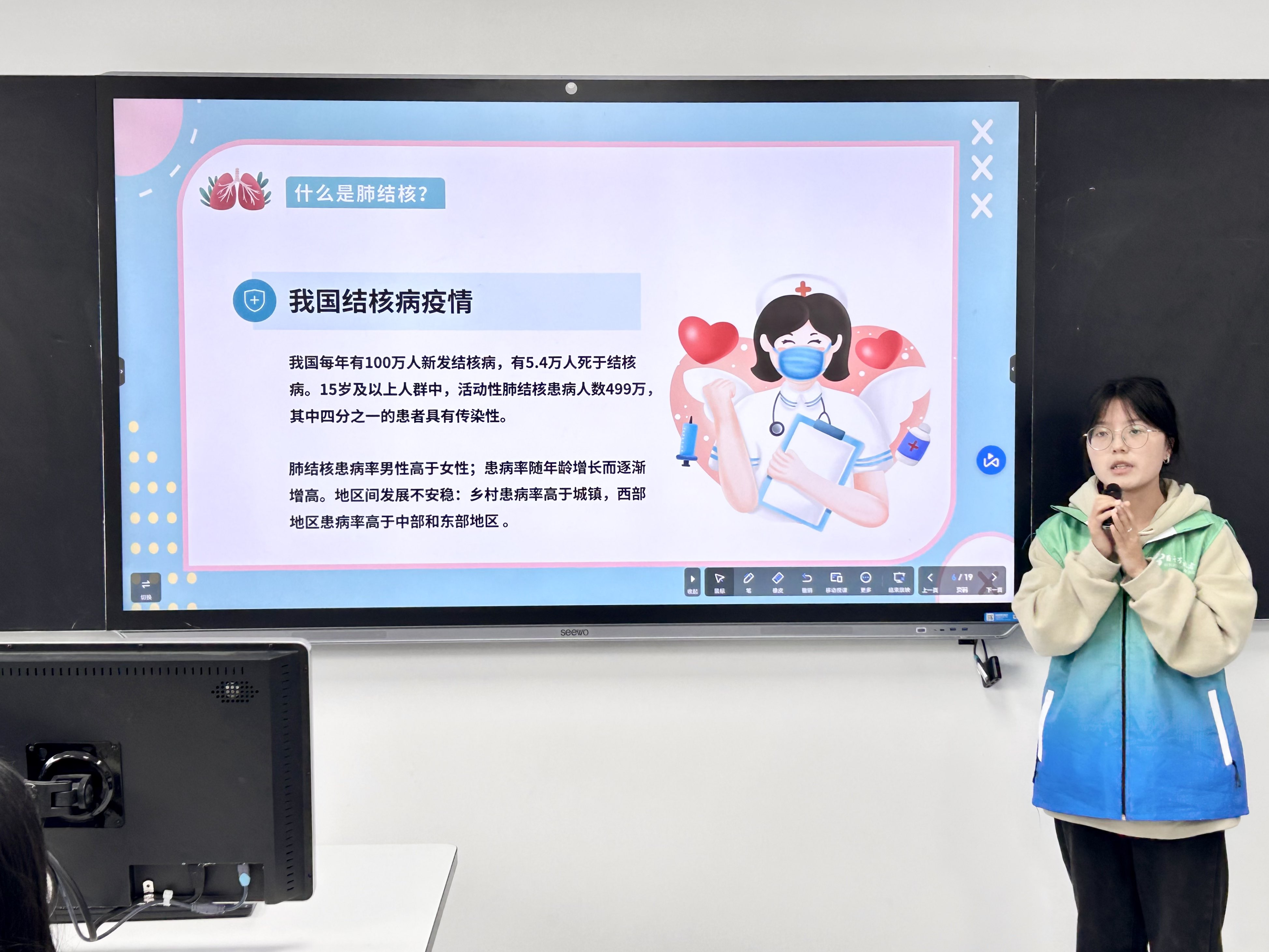 本网讯(图/文 大数据与人工智能学院 辜虹蕊 孙洪萍)为增强学生健康意识,提高大家对结核病的认识和预防意识,助力实现全民健康目标,2024年4月22日,云智志愿服务队云智宣讲团在7108教室开展主题为“关注肺健康 预防结核病”主题宣讲进班级团日活动。