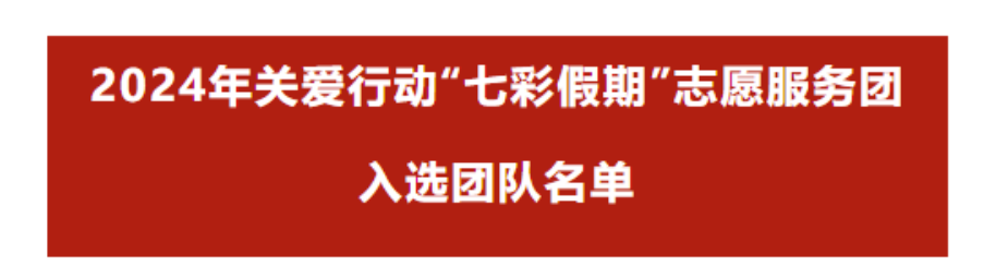 主办单位将为每支入选团队提供1个志愿服务工具包,为每名志愿者提供1份专项保险。希望入选团队按照服务计划,认真准备服务内容,精心设计服务形式,扎实开展好“七彩假期”志愿服务。