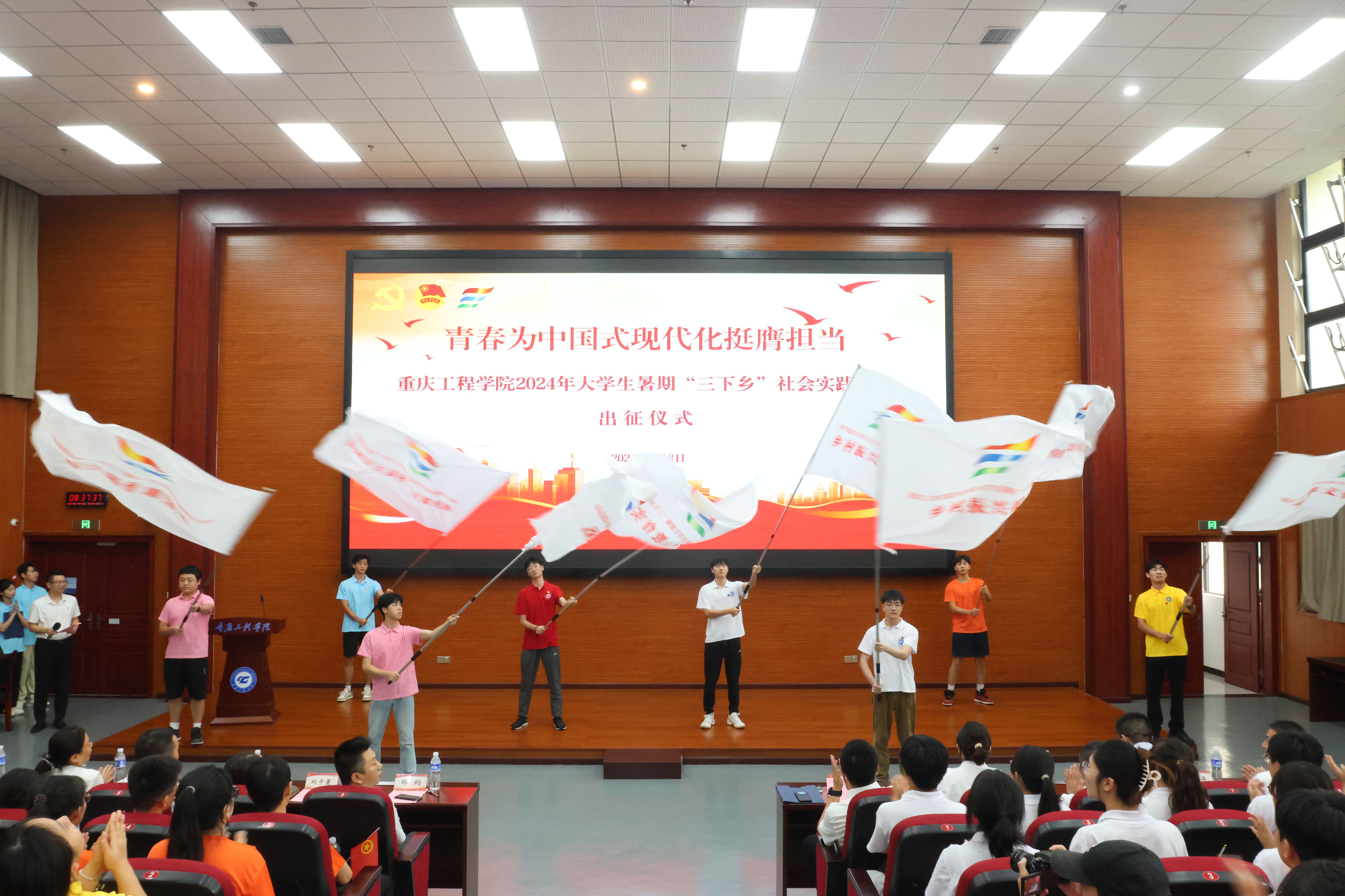 7月8日,我校在第七教学楼报告厅组织开展2024年大学生暑期“三下乡”社会实践团队出征仪式。校领导王建东、邹均,党委宣传部、党委学生工作部、校团委等部门负责人,各二级学院党总支书记、“三下乡”社会实践团队师生代表300余人共同参与。