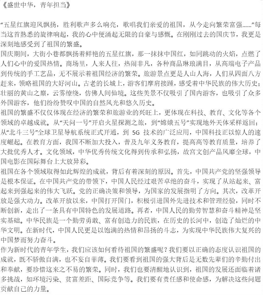 本次活动开展期间,便受到了学生们的积极响应。大家通过描述国庆节期间的所见所感,探讨作为新时代青年,如何看待祖国的繁盛,以及这种繁盛对个人的成长与发展有何影响。活动期间,同学们积极探讨国家发展的前景,同时也为校园文化建设增添新的活力。