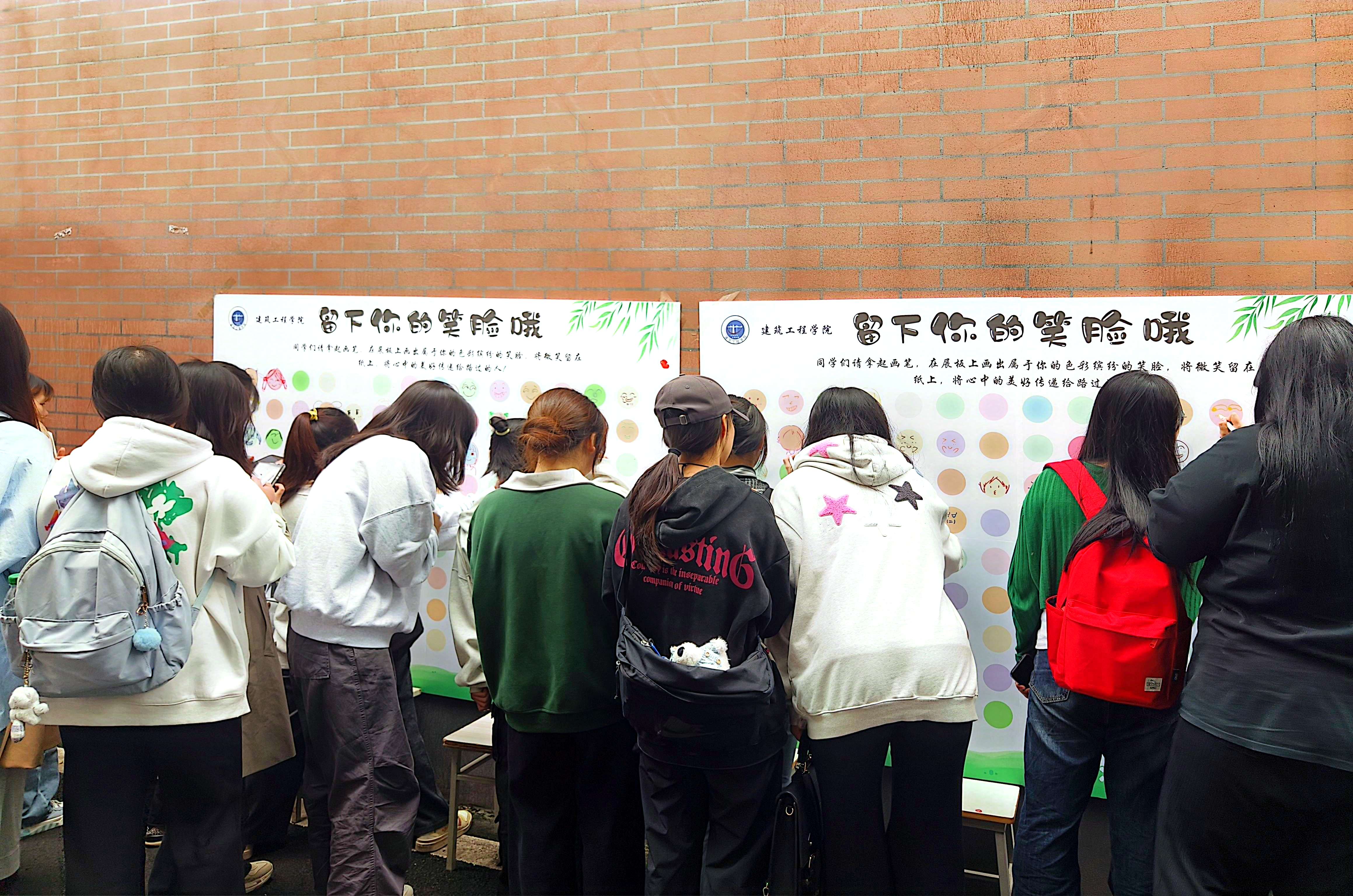 活动当天,现场准备了充足的马克笔、2m×1.5m KT模型版等绘画工具。同学们到达指定地点后,纷纷发挥创意,绘制出一个个充满温暖与活力的笑脸。这些笑脸形态各异,有的憨态可掬,有的阳光灿烂,仿佛是同学们内心美好情感的生动映照。活动现场气氛热烈,充满了欢声笑语,一个个精心绘制的笑脸展现了同学们积极向上的精神风貌。