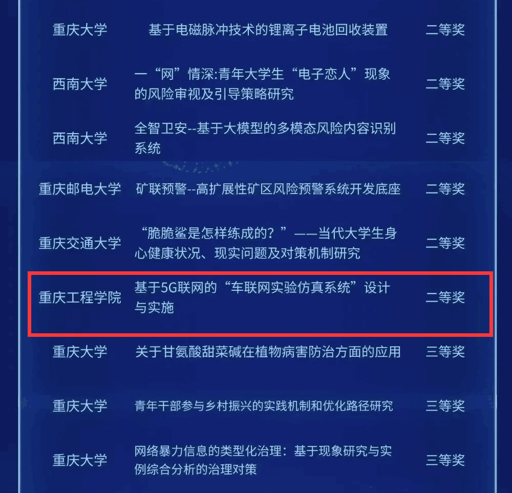 近日,由共青团中央、中国科协、教育部、中国社科院、全国学联联合主办的第十九届挑战杯全国大学生课外学术科技作品竞赛2024年度揭榜挂帅专项赛终审决赛圆满落幕。此次赛事汇聚了全国众多高校的优秀项目,共吸引2.7万余人参加,共有6500余件参赛作品,最终来自全国410余所高校和企业的1950余件作品入围终审决赛,经过多轮评审与展示,我校电子信息学院的参赛项目《基于 5G 联网的“车联网实验仿真系统”设计与实施》脱颖而出,最终荣获国赛二等奖。