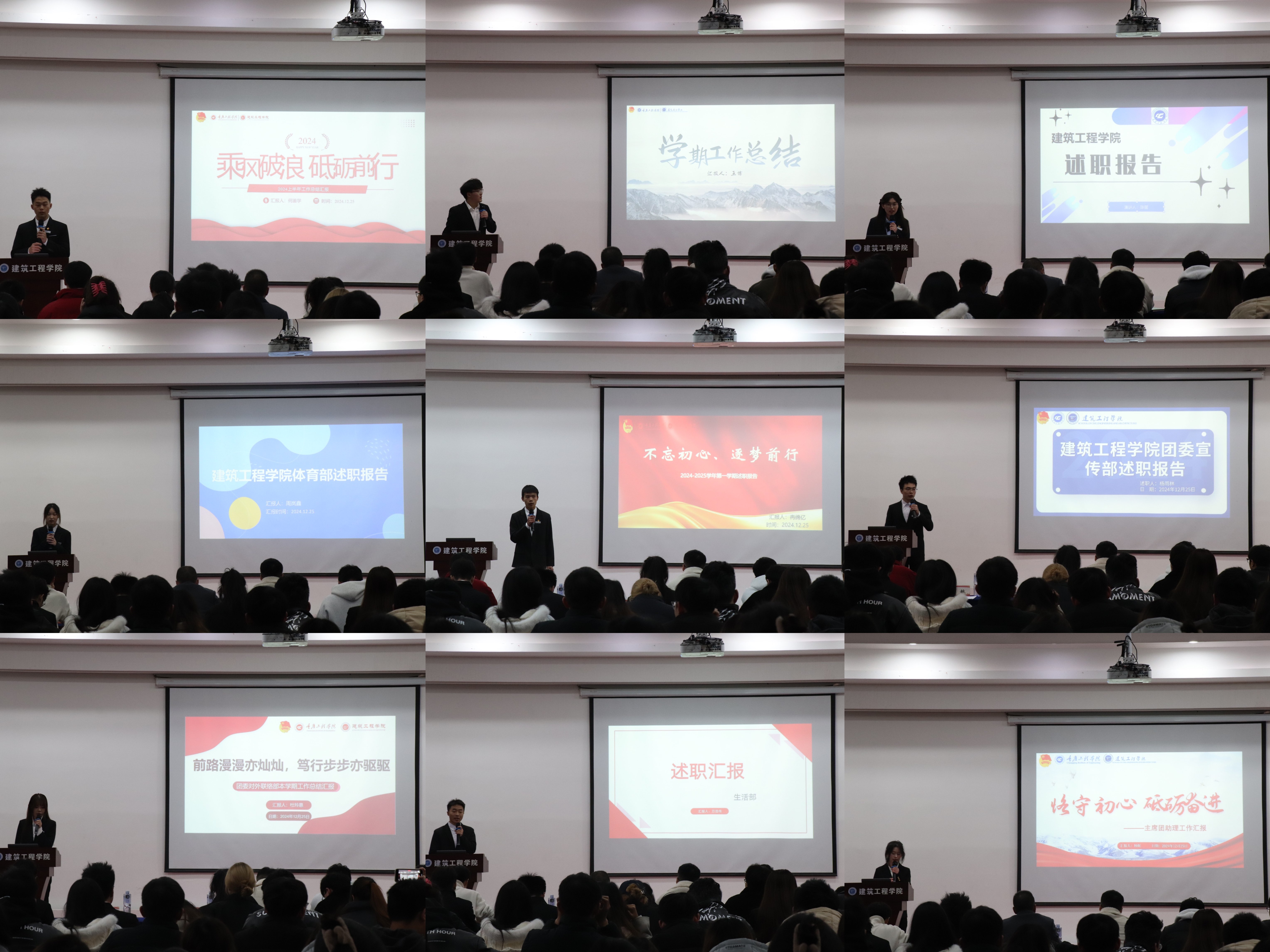 首先各部门负责人依次上台进行述职,全面阐述部门对接、活动开展、资料收集等工作情况,并重点展示了在校园文化、传统文化、体育赛事、志愿服务等领域的工作亮点与成效。接着,建筑工程学院团委学生副书记周乐东旭发言,回顾这一学期内团学佳绩,表明将持续创新工作方式,助力学院建设的决心。最后,学院党总支书记唐和平在听完述职报告后对团学工作给予高度评价,并激励团学骨干应保持奋进姿态,积极创新,希望大家加强思想政治引领、统筹规划、强化宣传,为学院发展添砖加瓦。
