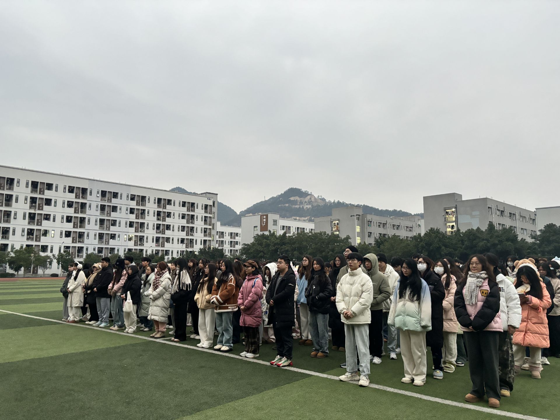 12 月 23 日清晨,新媒体电商学院在操场举行了主题为 “诚信之翼,扬帆考海”升旗仪式。此次升旗仪式由新媒体电商学院党总支副书记曾艳灵、分团委副书记石超伟、思政教师兼任辅导员冉敏、23 级带班辅导员以及 23 级全体学生、新媒体电商学院团委学生骨干共同参与。