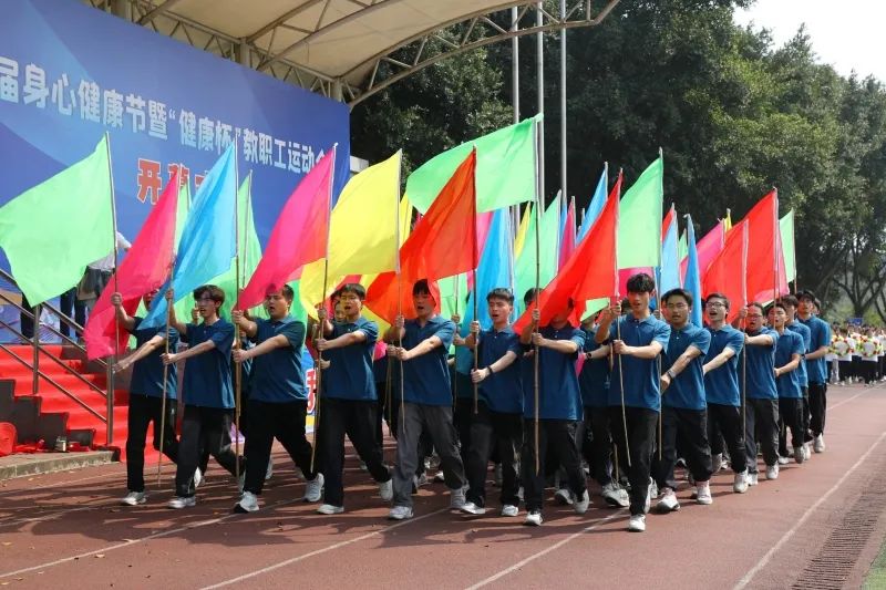 “鲜衣怒马少年时,不负韶华行且知。”4月10日上午,我校第九届身心健康节暨“健康杯”教职工运动会开幕式在南泉校区、双桥校区隆重启幕,全体在家校领导出席活动,各二级学院院长、书记及师生代表共同参加。南泉校区开幕仪式由副校长谭明术主持。激昂的《运动员进行曲》奏响,瞬间点燃了全场的激情,开幕式第一项仪式——各方阵入场。首先映入眼帘的是国旗方阵,他们迈着坚定有力的步伐正步走来,校旗方阵紧跟其后,迎风招展。运动会会旗和校风、校训、学风方阵依次入场,一句句振奋人心的口号,展示出我校优良传统与重工学子团结自强、拼搏向上的精神风貌。随着彩旗与花环方阵的到来,各学院方阵各展神通,带来一场场视觉盛宴,他们将专业特色与体育艺术完美融合,更将传统文化的魅力展现得淋漓尽致。国旗护卫队高举五星红旗,脚步铿锵有力,全体肃立,升国旗,奏唱国歌,全体师生热情高涨。