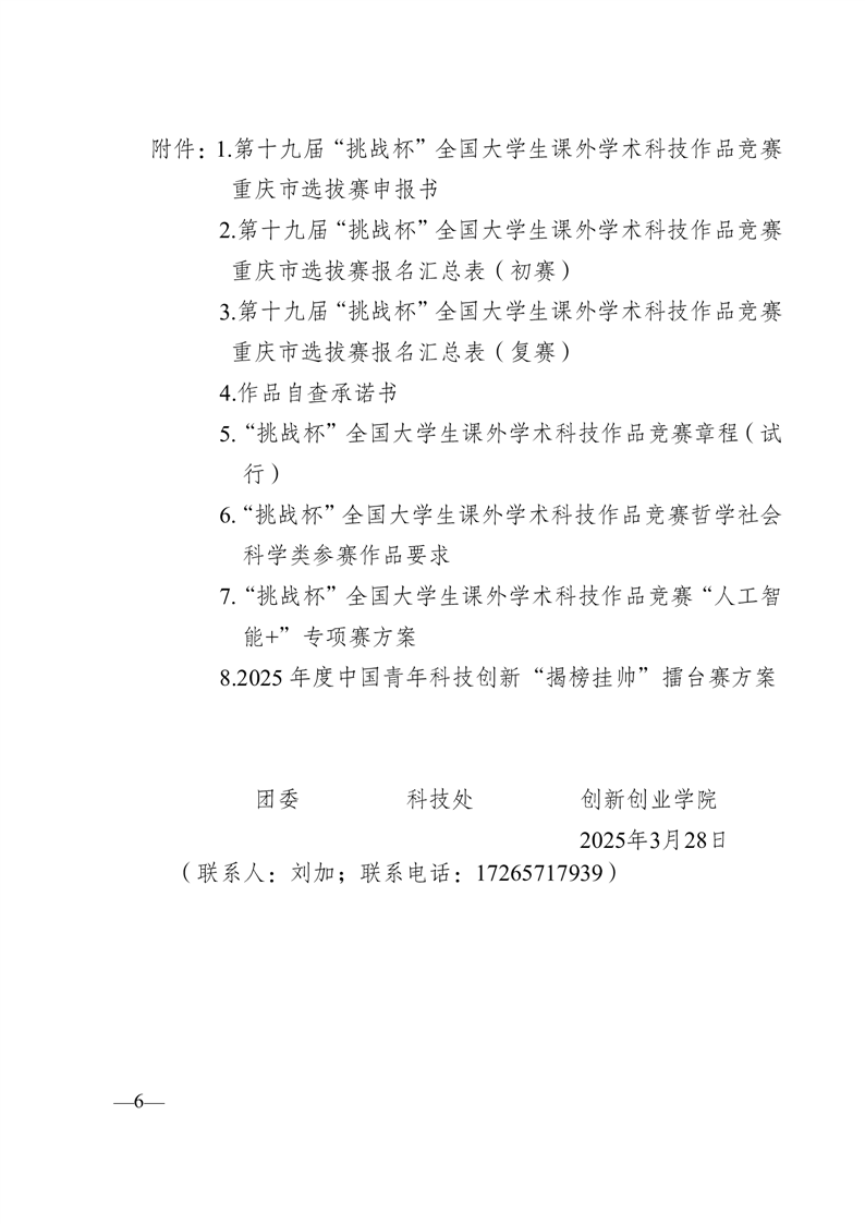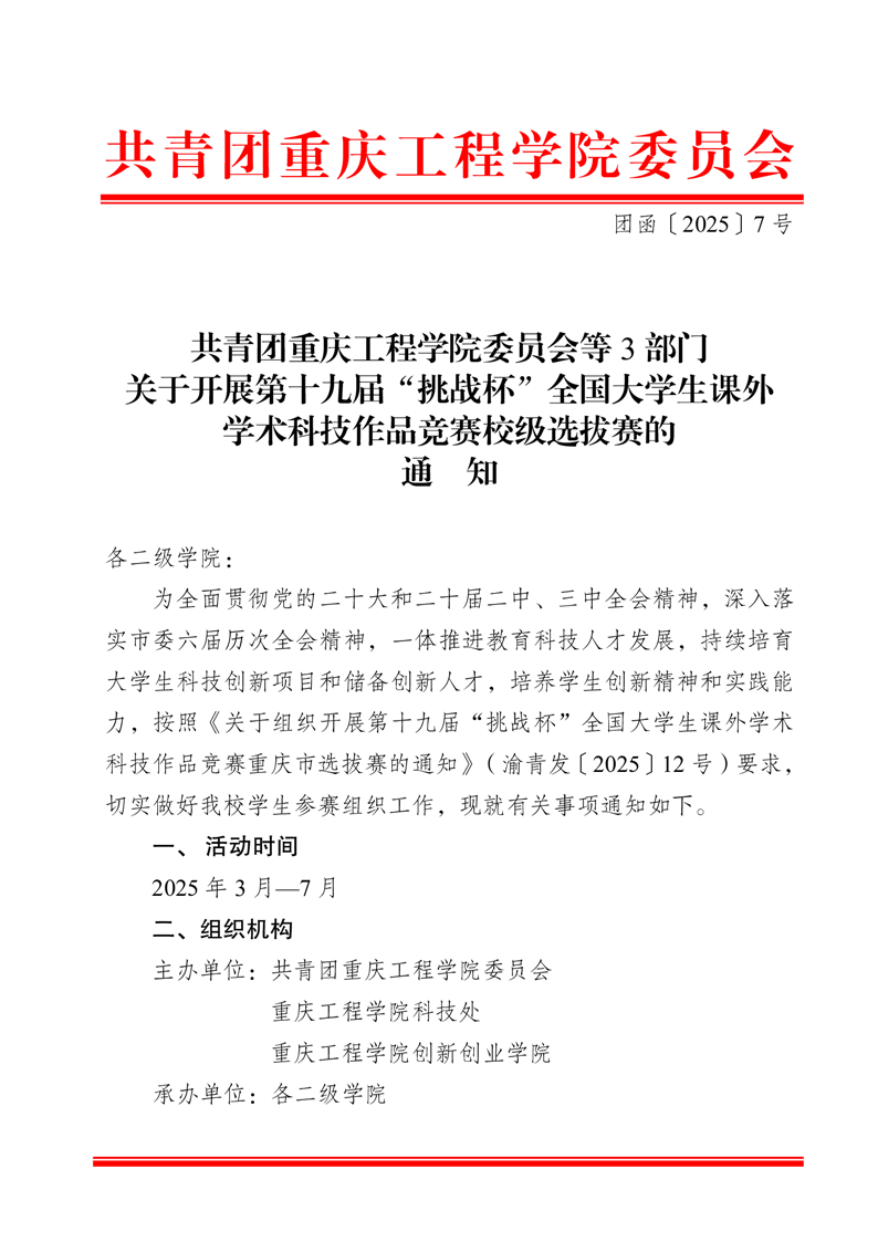 团函〔2025〕7号 关于开展第十九届“挑战杯”全国大学生课外学术科技作品竞赛重庆工程学院选拔赛的通知
