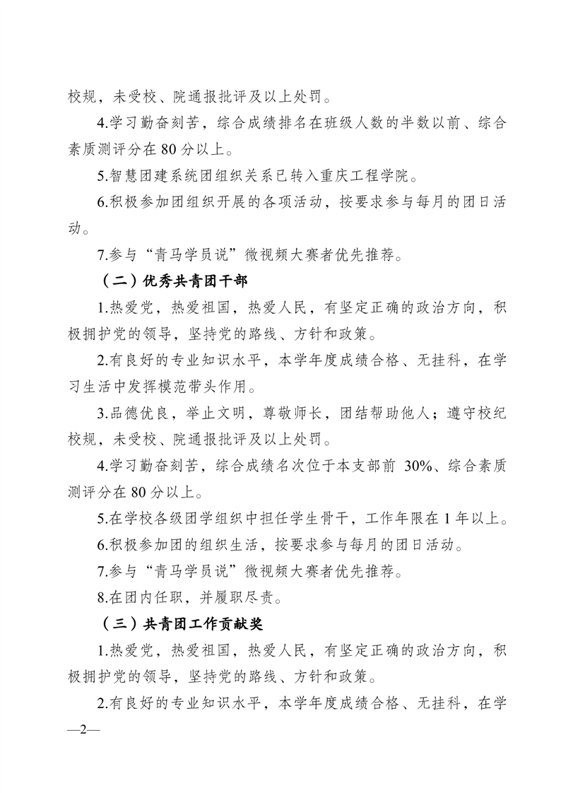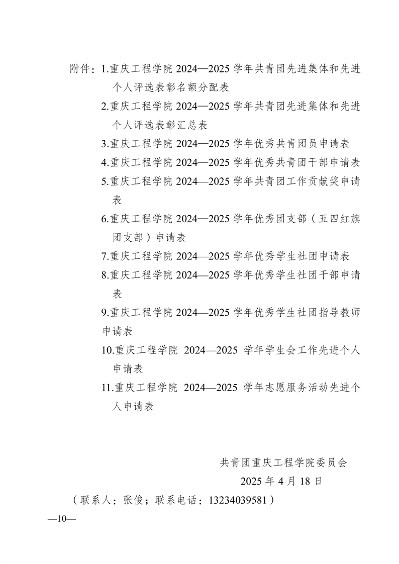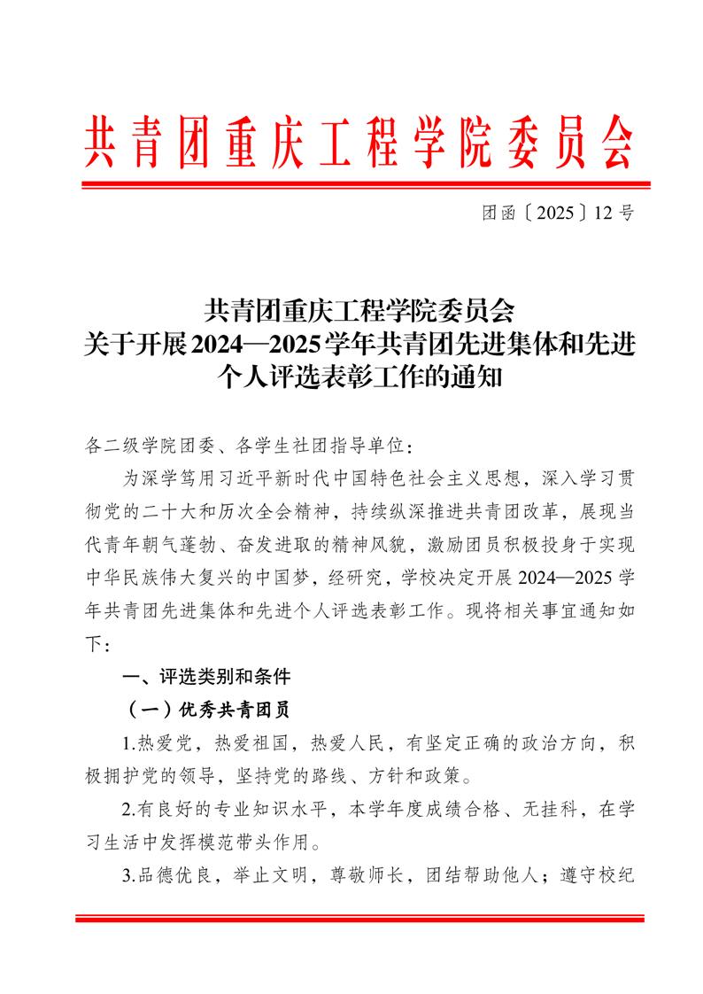 重庆工程学院团委便函2025-12号 关于开展2024—2025学年共青团先进集体和先进个人评选表彰工作的通知