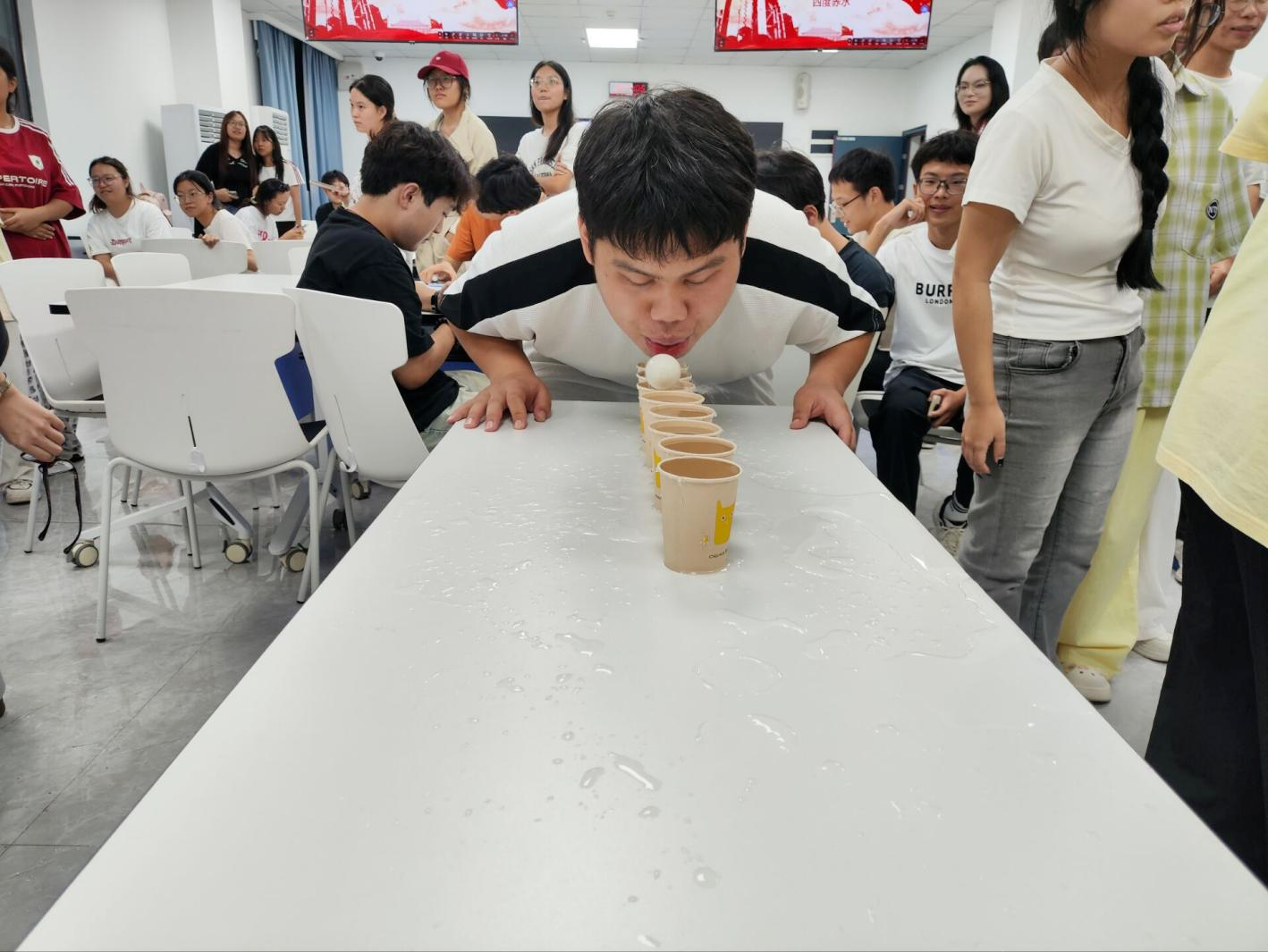 随后,“红色成语版你比我猜”成为团队默契的“试金石”。各队轮流派代表用肢体语言演绎“星星之火”“万众一心”“心向朝阳”等红色成语,其他队员争分夺秒猜测。大家以丰富动作传递信息,配合默契、集思广益,在欢声笑语中提升协作能力,也领会到红色成语蕴含的精神力量。最具挑战性的“四渡赤水”互动游戏紧随其后,桌上八杯满水纸杯的首杯中浮着乒乓球,参赛者需用嘴吹气将球依次传递,球落即重来,以用时最短为胜。队员们凝神屏息控球,队友轻声鼓励,紧张与欢快的气氛感染全场,大家在反复尝试与互助中,切身感受革命先辈不畏艰难、灵活应变、团结奋进的伟大精神。
