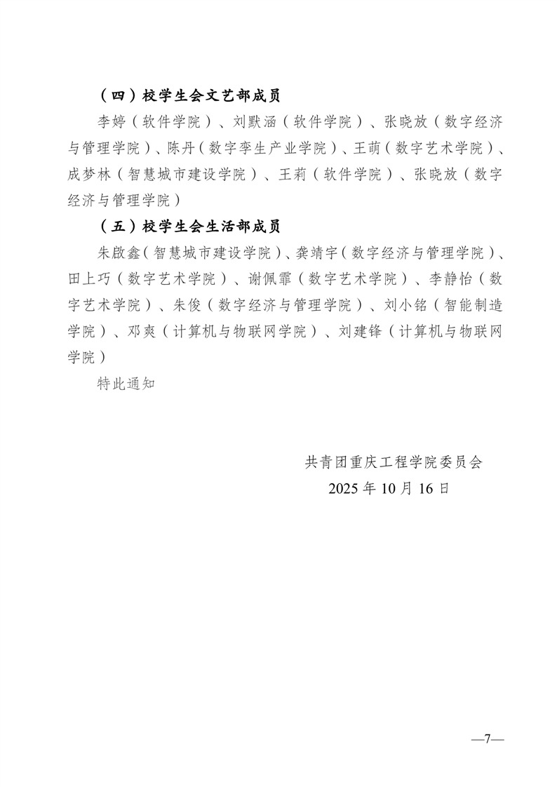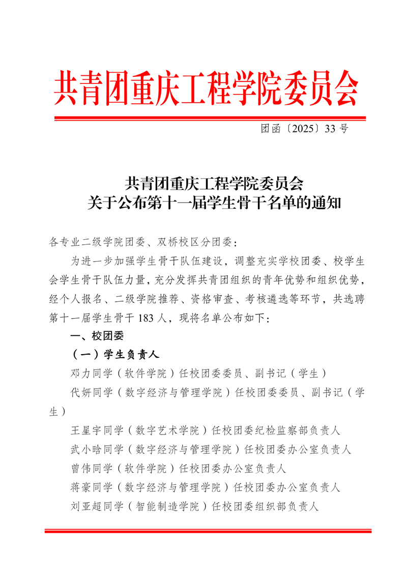 共青团重庆工程学院委员会关于公布第十一届学生骨干名单的通知