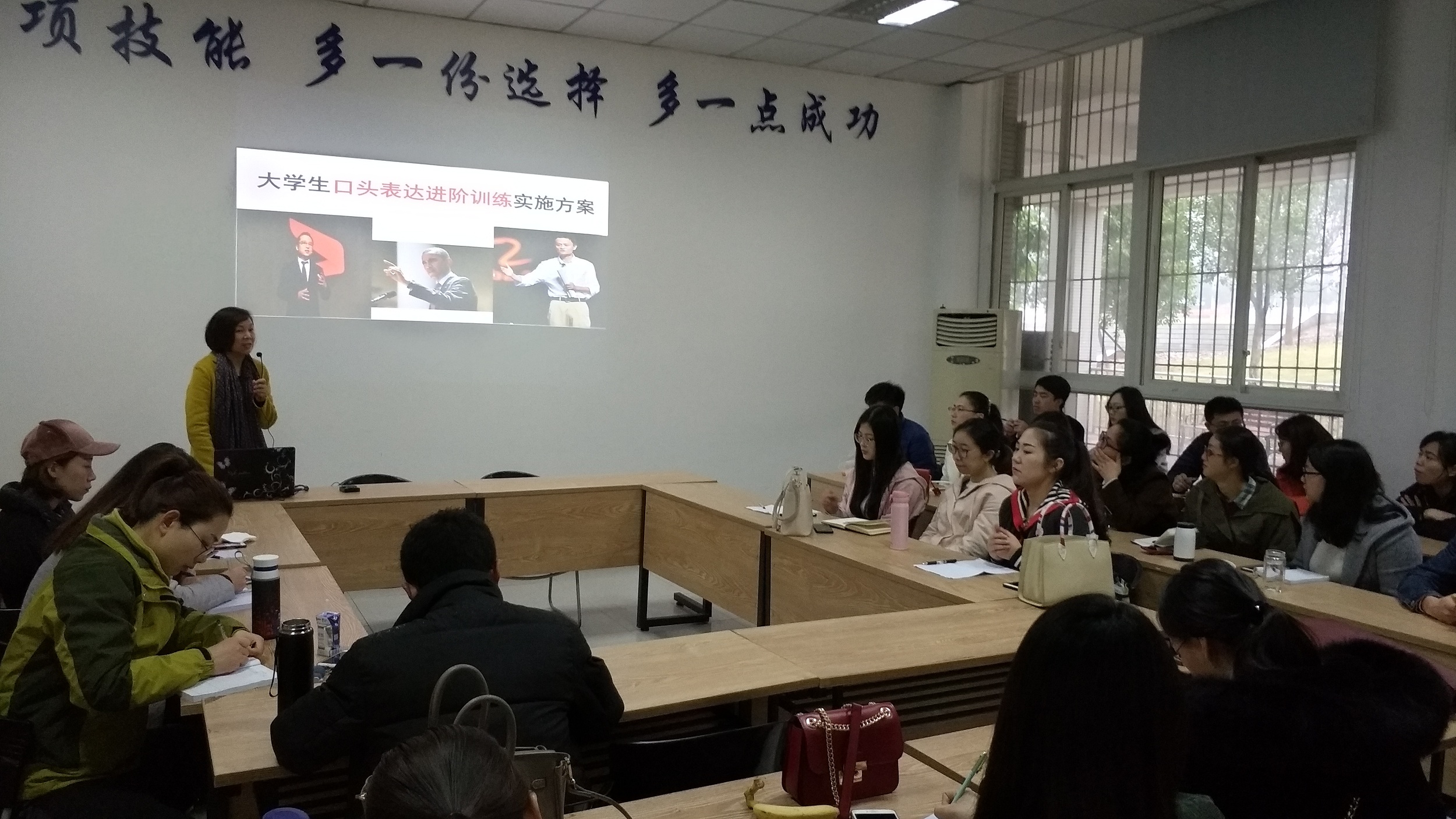 培训中,为进一步提升在校大学生的口头表达能力,邹春霞教授建议:为加大普通话培训力度,需要不断开展大学生演讲培训,采取理论结合实际、课堂结合实践的方法,以晨课课堂教学为平台,不断提高大学生的演讲能力。