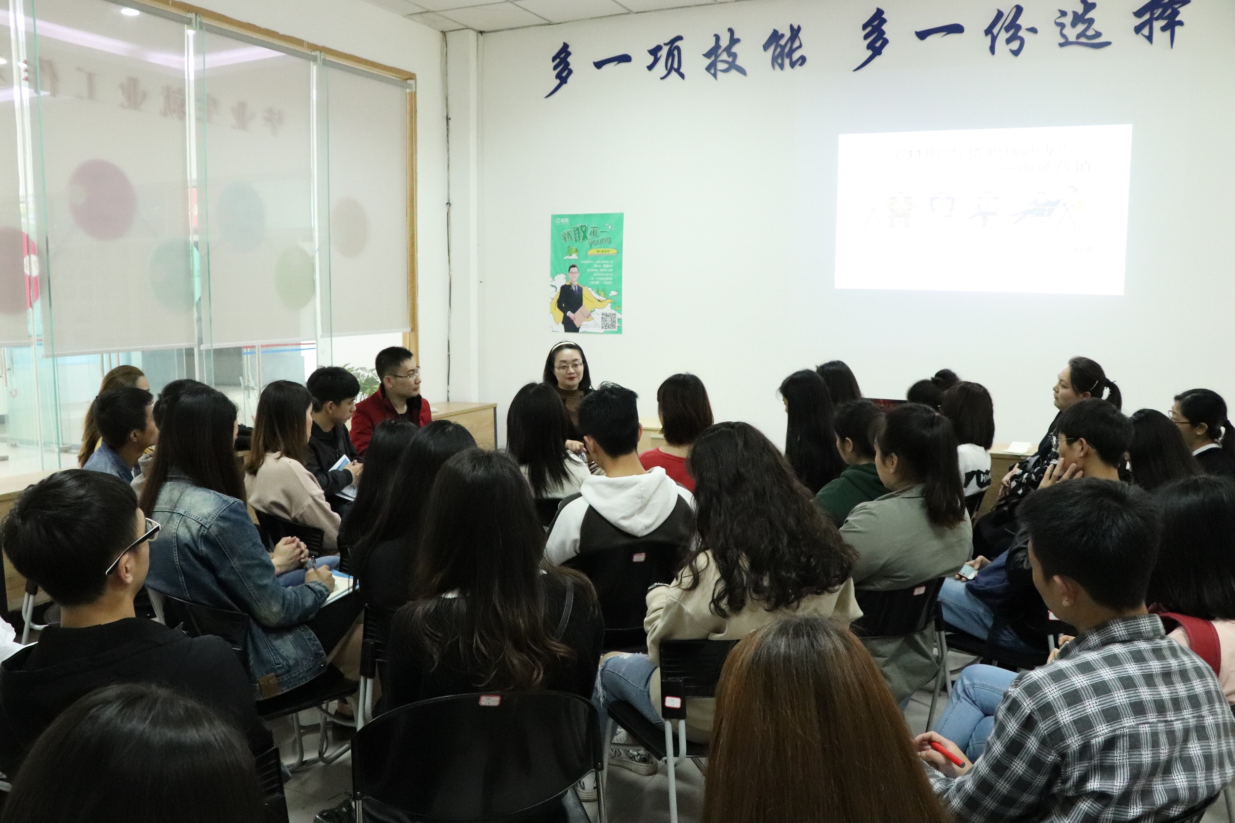 本网讯(素质教育中心)2018年3月30日下午,第十一期“灯塔职场沙龙”在大学生服务中心1-3举行。本次沙龙是由素质教育中心主办,职业发展协会协办,以“面试营销”为主题,邀请邀请到重庆市人社局大学生再就业项目指定专家高海鹰老师来担任主讲,来自全校的50多名学生参加了沙龙活动。